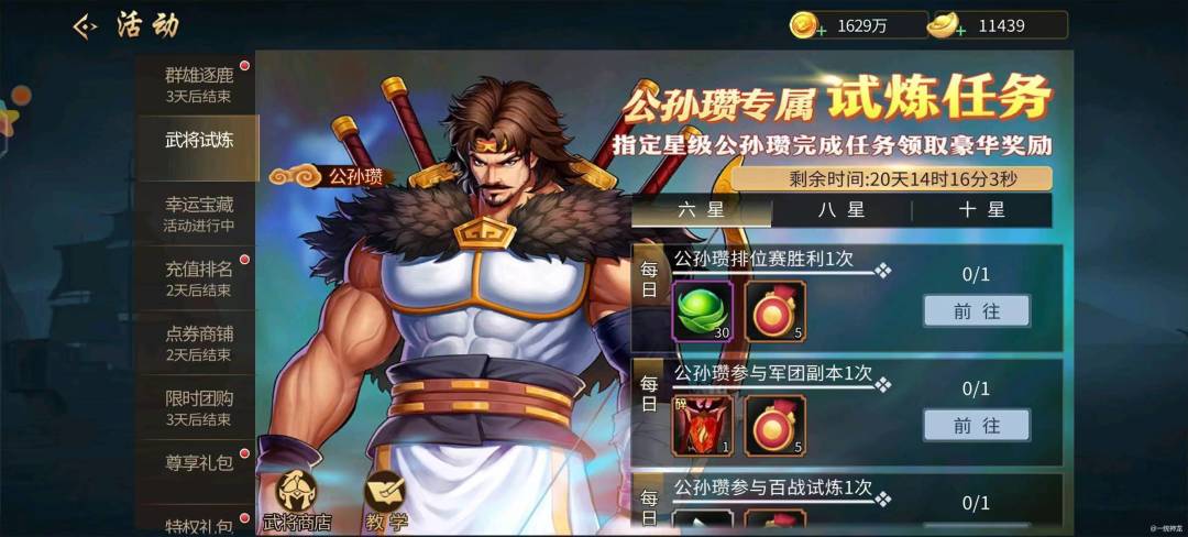 武将升星攻防血百分比额外加成,都是玩家反复吐槽几年才加的,如今为了提升新武将销量和升星,更是首次在8周年庆期间推出了试炼活动,为期三周,玩家每天、每周和周期内累计完成6星、8星、10星指定任务,可以获得指定养成材料和试炼币奖励。记住是每日任务每日完成、每周和不刷新任务累计完成!试炼币可以在武将商店兑换稀缺养成资源!其中六星公孙瓒完成所有试炼任务可以获得815个试炼币,八星公孙瓒可以获得最多1325