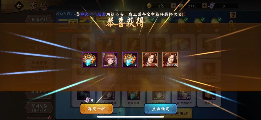 #攻略分享##三国闲话#秉承着过了这村没这店的想法,早上一咬牙我还是寻宝完成了300次,我这号运气一直不太好,前两次吧就出过一次50的郭嘉,这一次转满也没有一次50的孙策,虽然说这一次没有九折的寻宝券,但是有余粮的情况下激活周瑜和孙策还是可以平地增长近7万战力的,加上大小乔 激活和升星以及号令全军的称号加成下小10万战力还是可以的,这次活动我前前后后花了5万元宝,这一下就掏空了我所有,但是战力也增