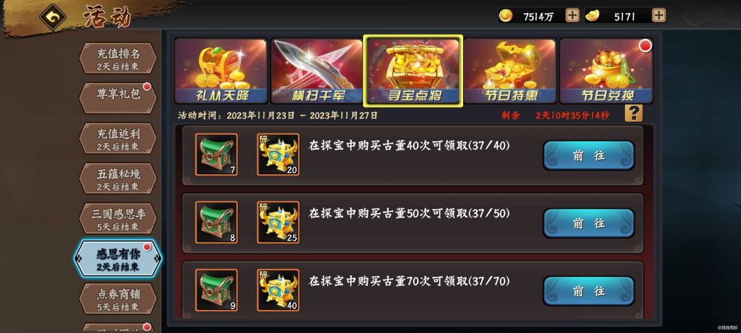 养成类游戏非常考验收集材料的耐心,金龙令则是古董探宝的秘钥,金龙令探宝十次不单是有概率获得一众星将中的一个,还有概率获得整个冠将奖励!冠将的威力在游戏的初期,特别是排位赛,有着星将无法比拟的实力和魅力! 金龙令获取 1. 巅峰商店:每月更新的巅峰商店会出售5折金龙令,这是售价最低的渠道,但是购买是有条件的,需要在当月巅峰赛积分达到500分以上; 2. 重大节日商店:如春节、周年庆、国庆节等,这是会