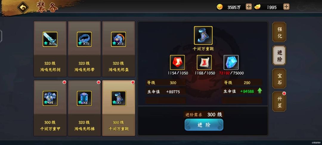 元宝不够,时间来凑,随着我们等级的不断提升,各种装备的获得途径逐渐开启。 个人觉得最值得拥有而且性价比俱高的游戏体验,莫过于,普通装备的养成,主要不花钱,还能做大爷! 普通装备:如果体力和进阶石充足,建议全部随等级提升;如果体力或者进阶石不足的时候,建议让含有攻击力的三种装备(武器、护腕、裤子)随等级提升,另外三种(帽子、衣服、鞋子)可以稍微滞后。 装备强化、进阶要做到按时进行;强化需要有足够的原