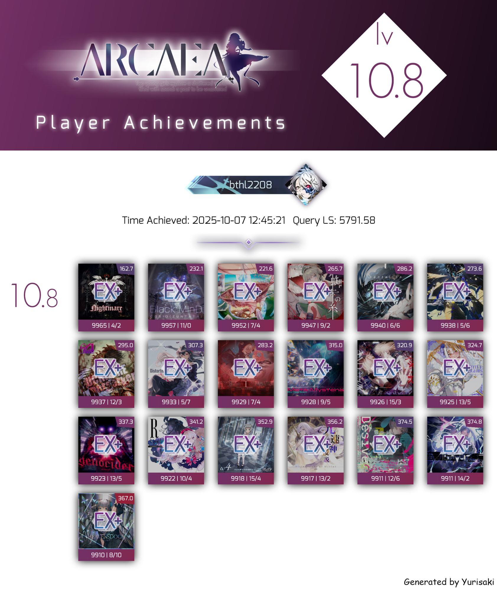 去年11.27那天,我还没有开始推这些歌的准度,至少没有像现在一样大推。 那时候账号是下面的样子: [Arcaea Progress] FTR | BYD | ETR 玩家: 1421050261 游玩:351 / 513 Clear: 349 / 351 EX: 339 / 351 EX+: 324 / 351 995: 292 / 351 FR: 257 / 351 PM: 237 / 351