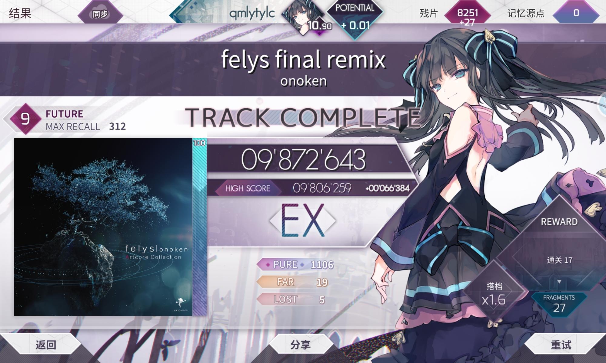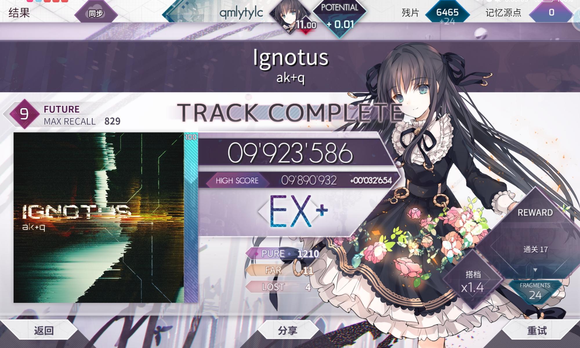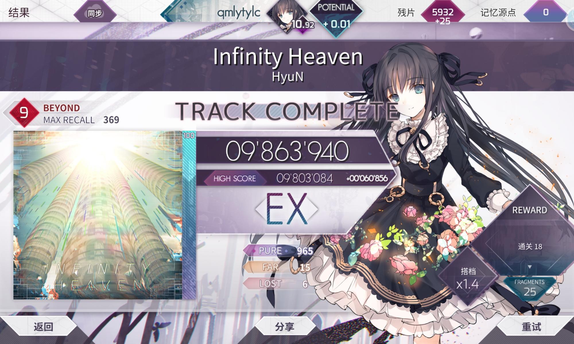 多次元宇宙大推,准度最高的一次,把差的最后一点补上了,地板也随之来到了12.84。距上次加0.01过了一个多月,本来很早就只差一点点了,但这段时间主要的精力都放在了小歌上,达成了9级及以下的所有ftr,etr,byd的PM,还推了两个简单的理论值,准度大幅提升。其实今天的推分进程可以用糟糕透顶来形容,想推9+的全p上来就在无人区byd那里卡了一个多小时没拿下,想推bof的FR在100多pc中性