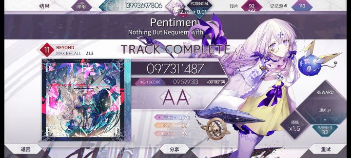 成就:arcaea ptt11达成完成时间:2024.7(具体忘了)—2026.1月10日消耗资源:主线第一包+红包+5首单曲+免费包arcaea是我入坑的第二款音游,当时的契机就是中考考完的暑假,我同学来我家解剧情的时候(当时好像打的是infinite strife那个堪比11的10+)当时我就被天地双轨道的谱面所震惊🤯,由于玩惯了phigros的平面音游,所以以至于完全看不懂,当时也是听