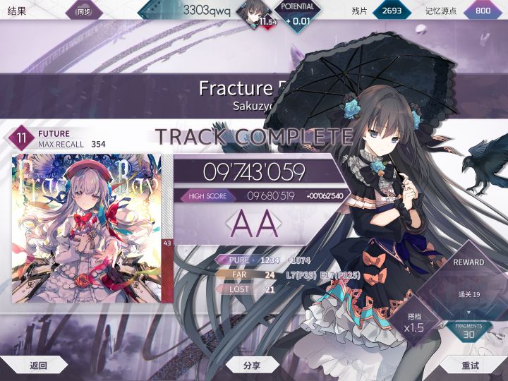 把终章解完以后就开始推(ttf没截上,初见prs956),然后就先试了超新星,一堆16分短交互直接爆了200+个小P打了红蓝,看了锁屏以后4pc过,一口气涨0.02!