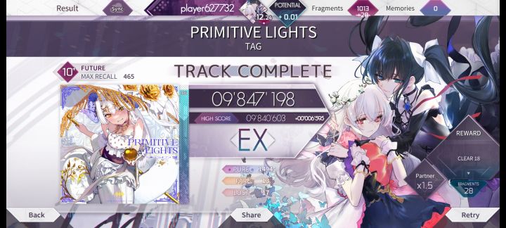 前两天推不动,就只能打主线,但收效甚微今天突然手感大爆发,打了3pc之后直接推到997遂尝试了两个9,总共历时8pc拿下10.4第二个单曲红框诞生!#arcaea #arcaea准度 #arcaea萌新