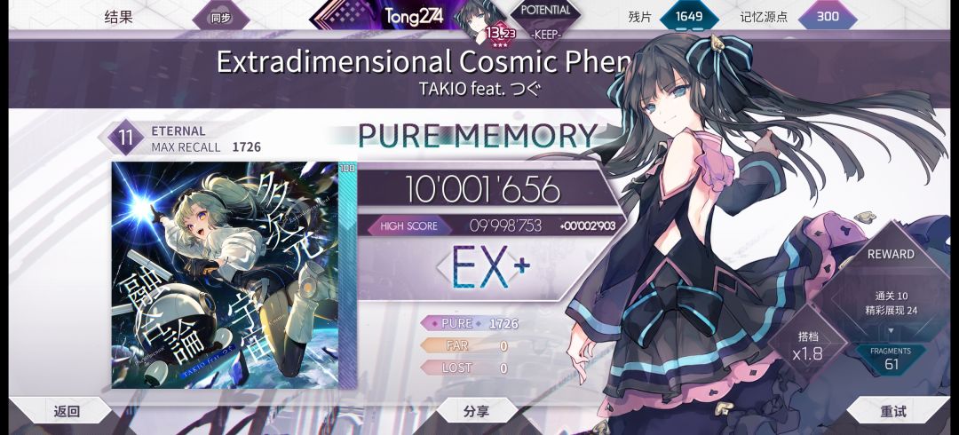 达成于2026/1/18 9:41:21 三天的时间跨度,打了四场,总计7个多小时的苦战,终于拿下 很早之前有能pm的预感,但是稳定性太差所以并没有太多心思去推;pm了ftr难度之后发现中间的变速纵连可以稍微套用一下思维模式,稳定性确实提高了,最难的段落反而变成了中间的长条跳拍 实际上每一场打下来最不稳的地方都不一样,最后一场最不稳的地方甚至变成了最后四个单键,pm的这把也是差点寄掉o(><;)o