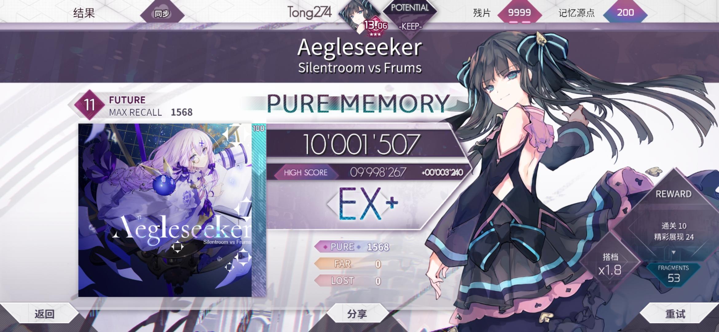达成于2024/4/20 14:49:06(手机截图时间) and in that light, I find deliverance. 2024/4/19,我本来想“悠闲”地给光追刷一个全连,结果打了一把过于完美的,甚至直到歌曲快结束都没有爆一个far,但是因为当时没有在录像所以把最后几个键放掉了。 然后性了22次,其中一次在1554combo处lost。😇 这个故事告诉我们有推分预感的时候一定