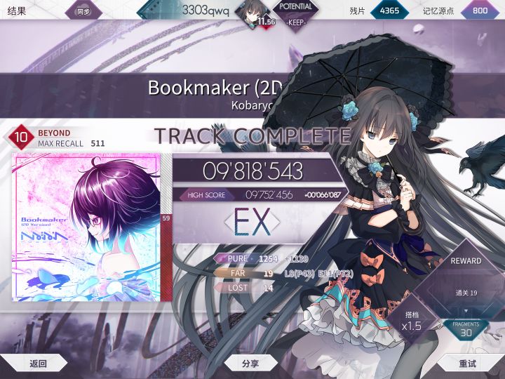 可能是比较简单的一首11了吧?毕竟是10.9升上去的(但如果你中间不用逃课手法当我没说)如果中间那段不能全押那我估计这辈子都PM不掉这首歌,不过对我来说最诡异的是1021-1037的那段纵连,估计是我最近都在练爆发和耐力谱,这种中速纵连已经控不好速了,总是会爆个far出来