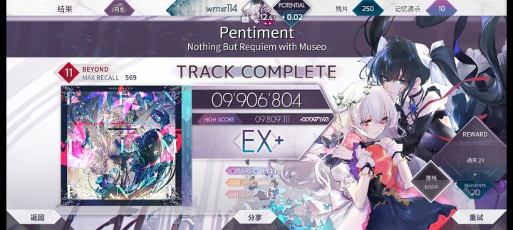 买了一些好推的歌,立刻开练,中午练了Overwhelm,大概一个小时推出来的(到最后不会拆就没继续推),然后晚上练中二,假面大概练了4+4pc就出来了,怒槌则是练完10min的分段直接打,硬是重开了好几次才打出来这个,LC更快,只是原速锁屏打了两遍之后实战大概4pc就出来了这批买的歌目前还有Climax、衔尾蛇、狂恋没推,明天应该能摘星,等我好消息#ar