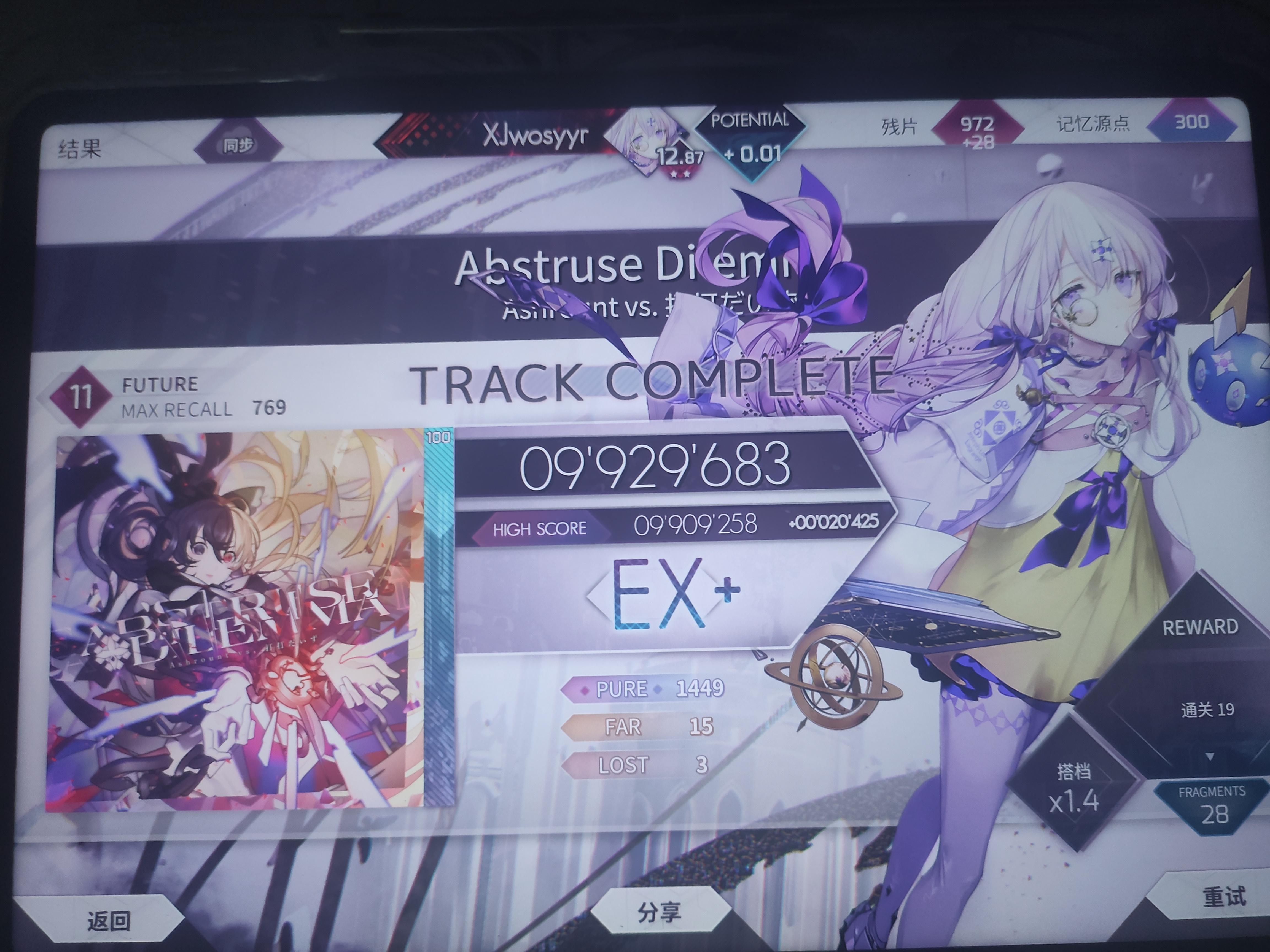 8+及以下的ftr,etr全部PM,除了摔死和记忆工厂基本都是3把以内秒杀,还打了两个理论值。现在开始按顺序推9,平均小p数在15到25这个区间,有几个蛇占比多的能打进10小,虽然我感觉自己的准度提升了很多,但从9开始就有更多更加复杂的节奏出现了,同时某些令人难受的定位也会使爆小概率大幅增加,总之现在的目标就是推PM的同时尽量推准(能进排行榜就行),预计等推完9+就能到300PM了。目前离13.