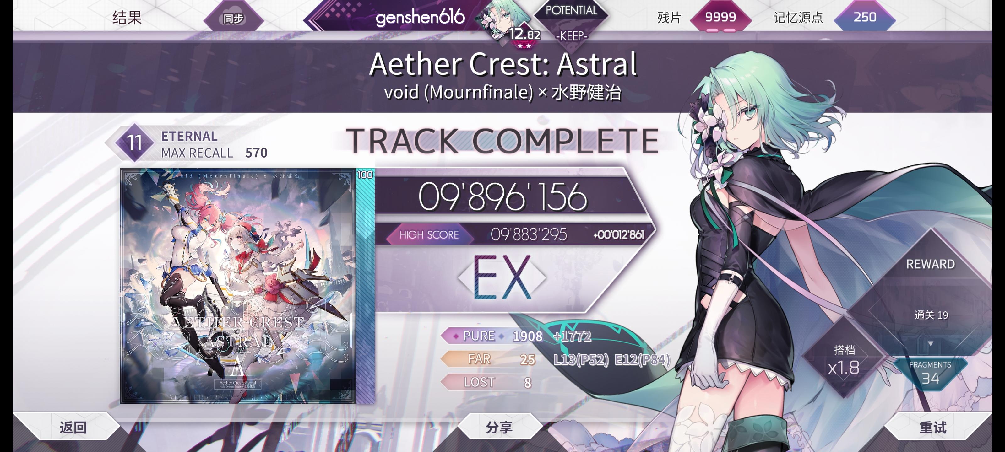 达成于2026/1/18 9:41:21 三天的时间跨度,打了四场,总计7个多小时的苦战,终于拿下 很早之前有能pm的预感,但是稳定性太差所以并没有太多心思去推;pm了ftr难度之后发现中间的变速纵连可以稍微套用一下思维模式,稳定性确实提高了,最难的段落反而变成了中间的长条跳拍 实际上每一场打下来最不稳的地方都不一样,最后一场最不稳的地方甚至变成了最后四个单键,pm的这把也是差点寄掉o(><;)o