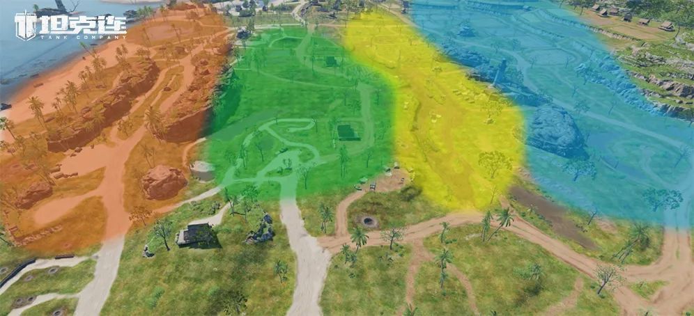 各位指挥官们好! 新地图“海岛边陲”的部分美术表现已经在之前的一篇文章中进行了展示,本篇文章将与各位指挥官分享这一新战场可参考的几种战斗策略。希望通过这些分享帮助各位指挥官提前了解新战场,设计对战策略。 海岛边陲 我们可以将整个战场分为四个小区域进行分析,以整理出战场区域间的路线差异。结合下方的俯视图,不同颜色的区域即为划出的战区。我们将依照顺序逐个介绍。 首先,让我们将注意力转向橙色区域,这是地