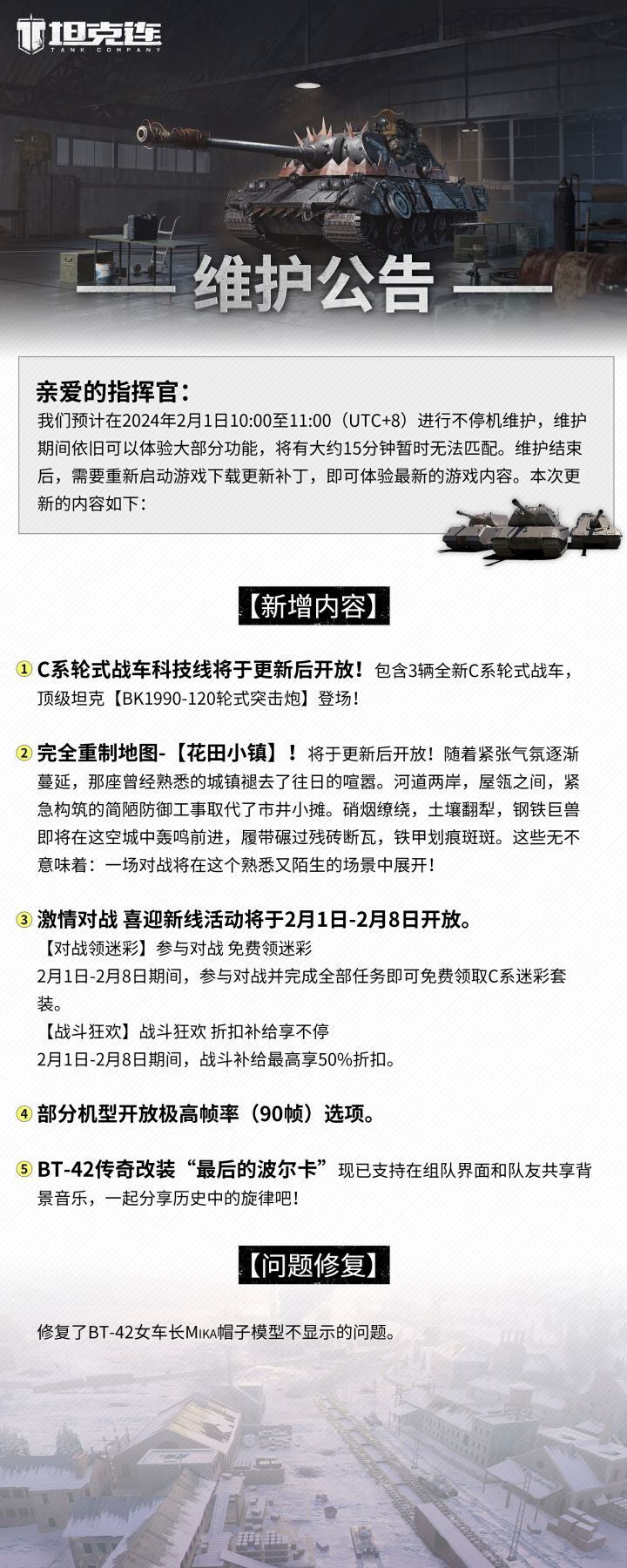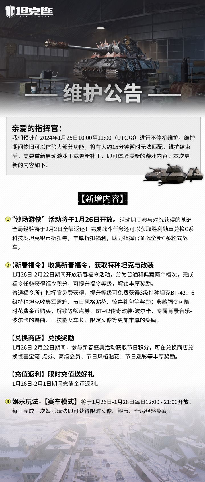 《坦克连》资料片公测,除C系坦克外还有诸多新内容、福利等待长官 全新新图“燃烧铁原”与OB观赛“裁判模式”同步上线 参与游戏活动最高领3台金币,限定涂装、头像!礼包福利:tank6666 、tank8888