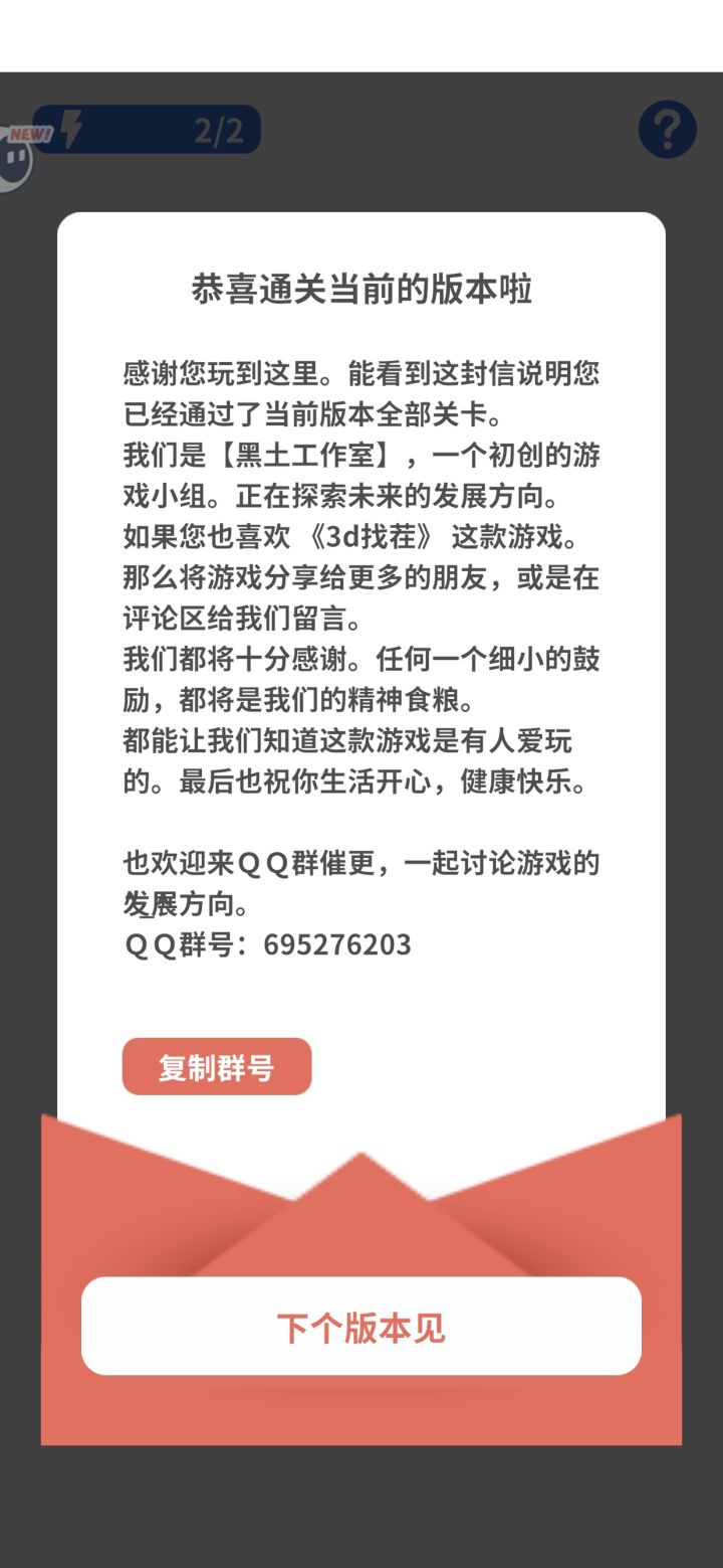 总的来说是一款很有创意的3D找茬游戏。在经典的大家来找茬游戏玩法的基础上,增加了3D的概念,从平面图片变成了立体的物体,玩家可以通过翻转角度以及放大的操作来进行观察对比,找出其中的不同,给人耳目一新的感觉,确实看到的区别于传统找茬游戏的新意,喜欢这类游戏的玩家还是值得体验的。但游戏的体力系统我认为是不友好的,玩不了几关就得看广告,这点也是我主要扣分的地方。