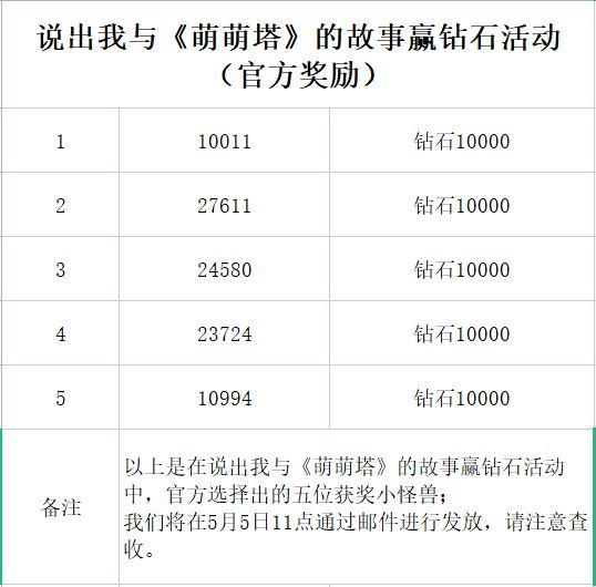 我与《萌萌塔》的故事赢钻石活动,官方奖励名单新鲜出炉