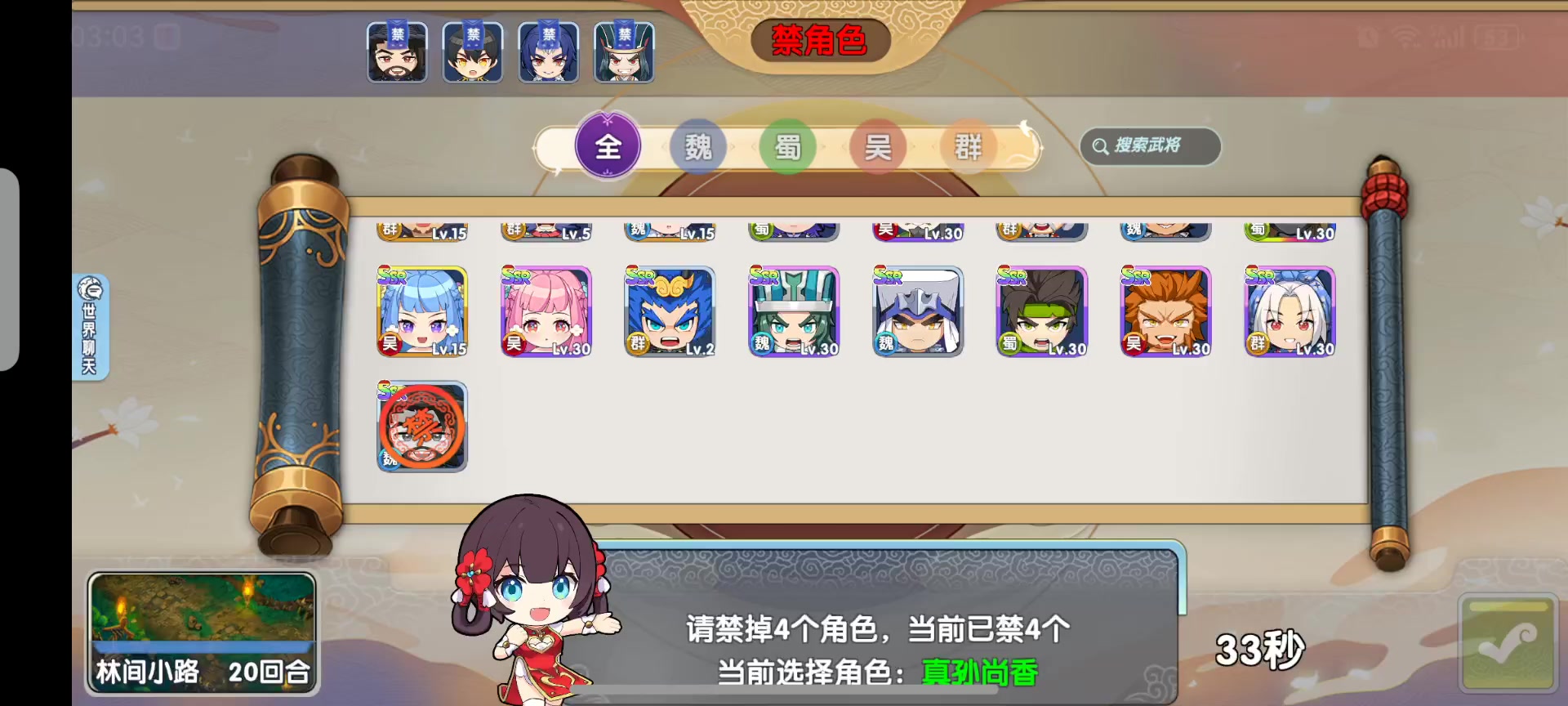 刘禅,策略型 得意武器 剑 专属武器: 镇山剑,3速,20攻 章武剑,4速 ,20攻 金玉剑,5速,22攻 初始行动卡: 决斗 一进 五谷丰登 初始战斗卡: 1.双股剑,丈八长矛,烧鸡2.双股剑,青龙刀,包子3.双股剑,神木弓,遁甲天书 技能: 书中有名:可以选择是否放弃自己的一回合让一位队友额外行动一回合,等级决定回合开始时发动的概率 LV1:50% LV2:55%