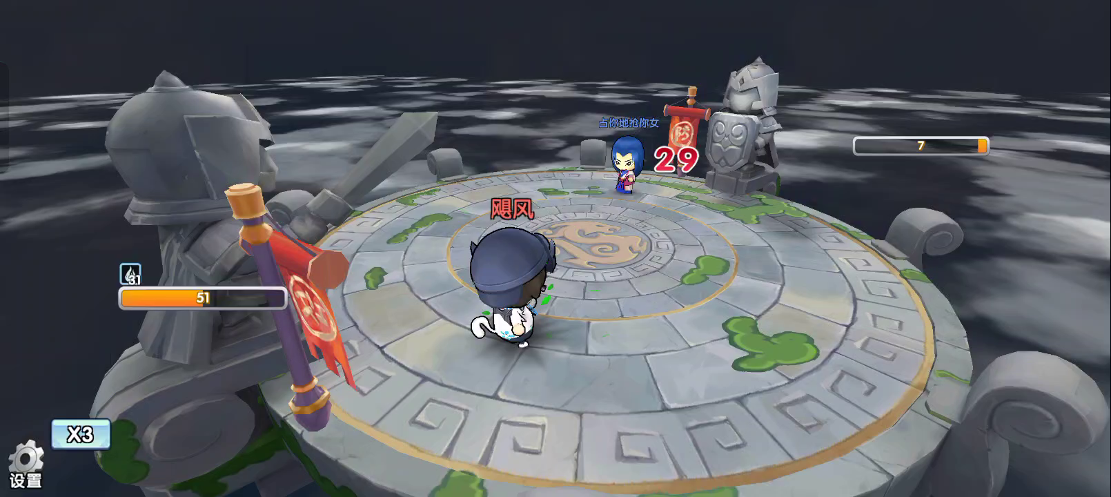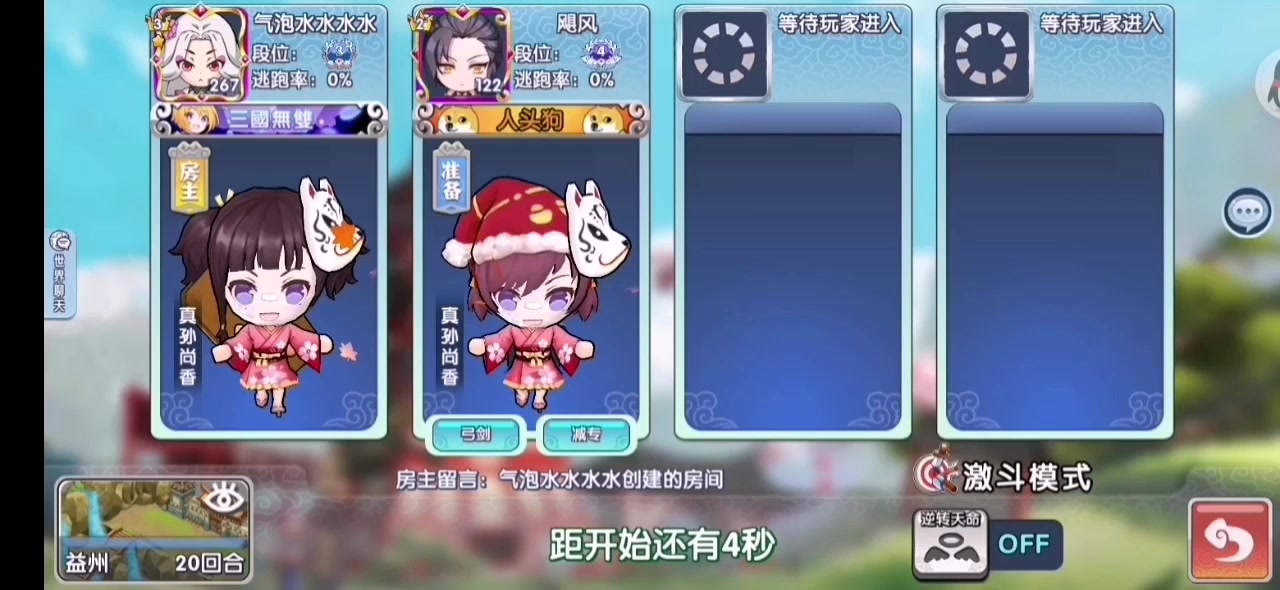 六六这是我小号,许昌大号第一天武道我星彩被对面星彩禁止穷了,汝南大号第一天武道我何太后被对面何太后打劫穷了,体验有点差。(用到了同样的武将,禁选也没啥问题,运气真是狗屎) 队友是马云禄十回合左右看到局势不妙,竟然自己退出游戏了。也没落后太多,而且潘凤马云禄属于后期武将,前面回合被揍趴下也正常。 不过我有他账号登录,看到离线状态,自己赶紧补上他,继续打。