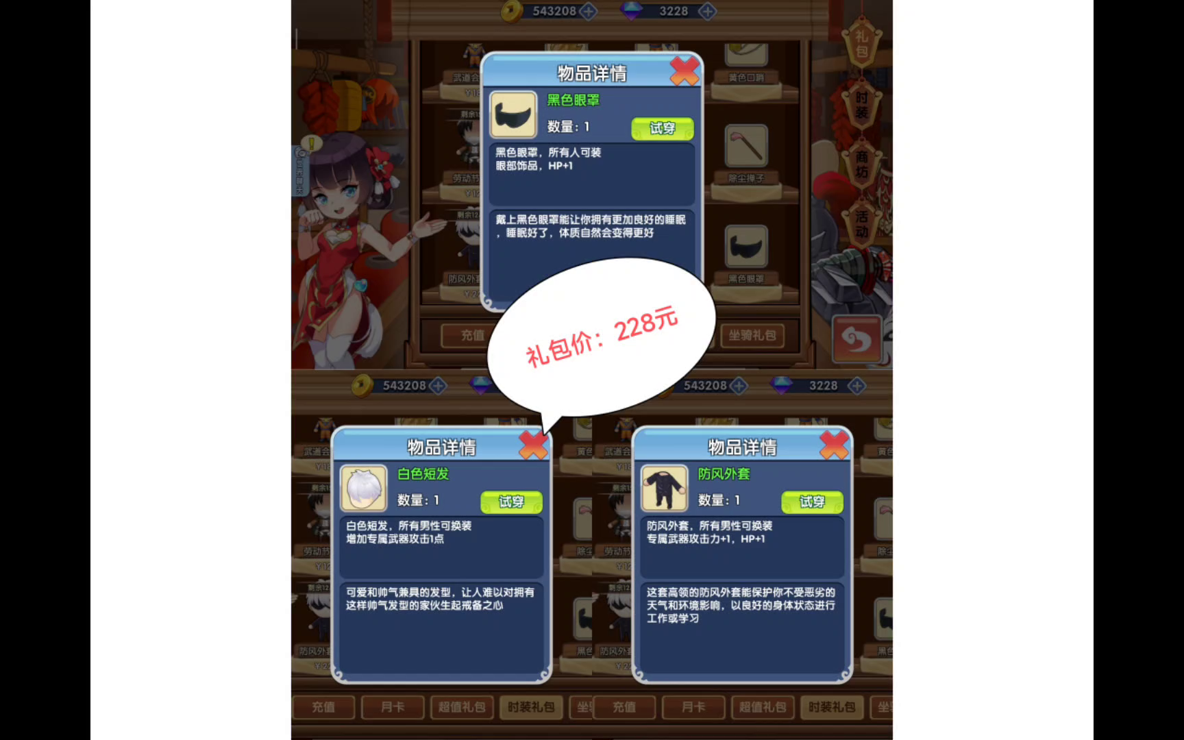 注:每年只出现1次购买机会,错过再等一年!!! 解析:专注于属性的玩家,除了新年288时装礼包必须购买外,其余均无需购买,纯过路费时装,武道会时装7个冠军勋章:眼部+10%过路费,搭配年套,过路费时装基本完整。追求完美过路费套装、以及出时装装扮、玩家应购买。 提问:官方提问环节: Q1:比如国庆节等节假日时装礼包有在做吗? Q2:有偿钻石能买到的时装是否考虑下架时装礼包? To3:节假日礼包没有特