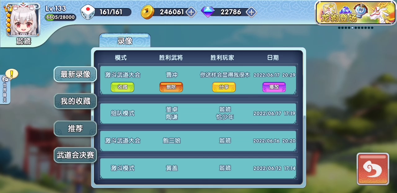 这个对手跟我一个商会的,之前武道碰一起过两次。这次一雪前耻。由于之前他用大乔恶心过我,这个大地图,我必须选个完虐大乔的武将。虽然是大地图,吕玲绮不太吃香。 他选了华佗,挺好对付,虽然仙桃多,但是吕玲绮的流血会弥补掉仙桃的血量,吃亏的就是死了不付钱。手里现金不多。幸运的是魔王之威每次都能触发,我残血的时候,对手打不到我。 我很多次决斗都把他打死,因为他手里有仙桃,我怕他吃了,我打不过,就没用专武控血他。吕玲绮能拿到很多牌,也不太怕治疗。拿不空的。 我40来级,他50来级的时候,双人武道队友都是人机,跟我俩激斗差不多,他用真郭嘉赢了我的曹仁,在徐州夜地图。 后来100级左右时候,武将也不多,能打的就剩下马超,虽然马超在赤壁地图并不吃香,她用大乔。在赤壁夜地图里赢我。运气好的他在酒馆里摸到两个烧鸡,一个葫芦之类的武器。这三个宝物足以让觉醒的大乔残血打我三块地。他还空城,我打不了他。十回合之后就投降了。