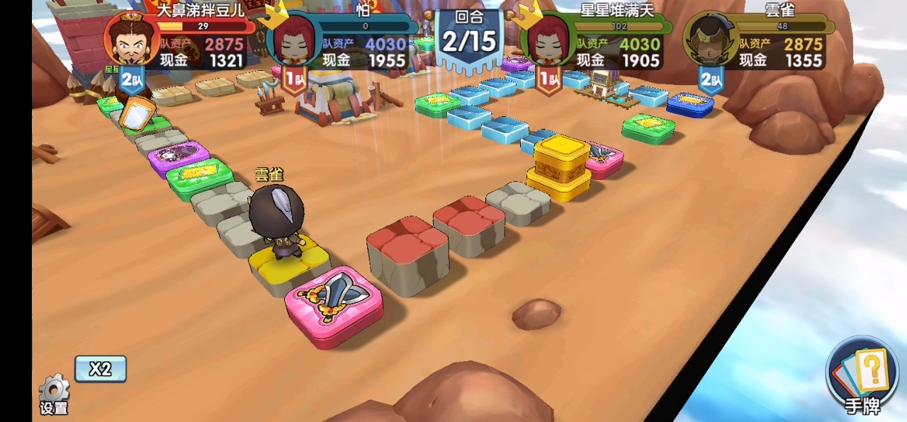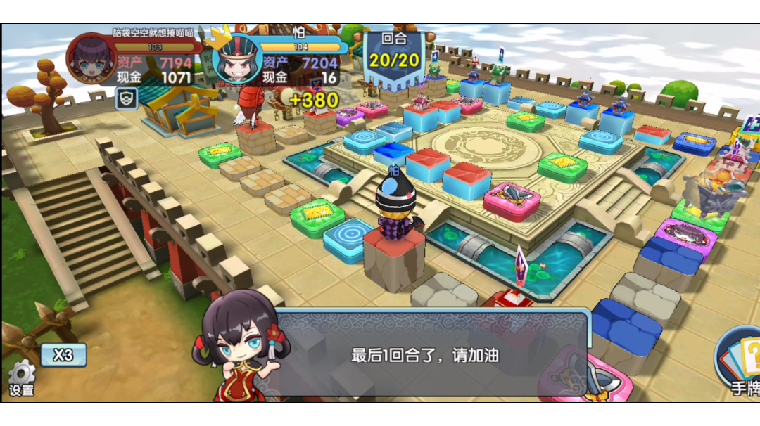 真张飞是人机,当我看到我有两块地,对手老人一块地,我猜真张飞会决斗,提前给他盖了医院。郭嘉踩上我的地,张飞发出震慑技能。我趁机盖个钱庄,又触发多多益善,郭嘉就破产了。 最后决斗阶段,破了老人的小刀,虽然牌不值得破,但是不破我就输了最贵的地盘。还得再打回来,费工夫。恰巧击败,又多多益善,让他破产了。😁