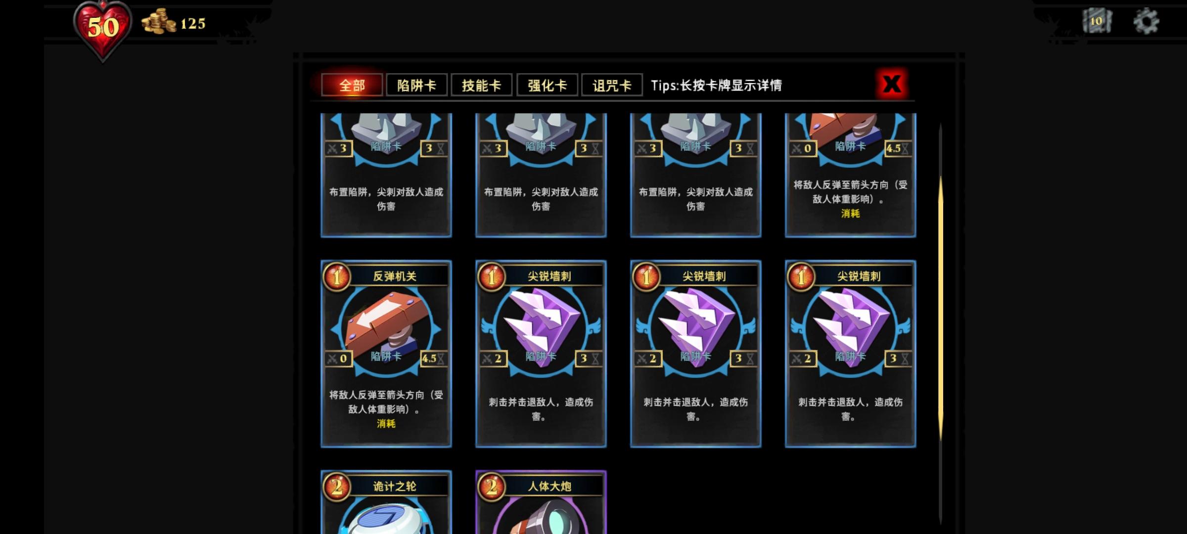 我爬到第九关的时候才攒够恶魔眼球,还得算上签到给的几百个 1.每通关一次可以选择一张恶魔卡2.前几关用的最多的就是反弹机关,因为可以秒杀,只要有水就很好用3.前期恶魔锯齿也很好用,伤害高,还挺长,每用一次,下次减少一点耗能,我用它通关3次4.爆金币词条很好用,用于刷金币很快的5.刚开始玩的时候,通关都有40几张卡,后来发现闪退很