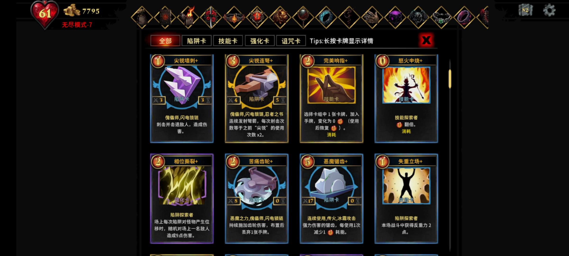 我爬到第九关的时候才攒够恶魔眼球,还得算上签到给的几百个 1.每通关一次可以选择一张恶魔卡2.前几关用的最多的就是反弹机关,因为可以秒杀,只要有水就很好用3.前期恶魔锯齿也很好用,伤害高,还挺长,每用一次,下次减少一点耗能,我用它通关3次4.爆金币词条很好用,用于刷金币很快的5.刚开始玩的时候,通关都有40几张卡,后来发现闪退很
