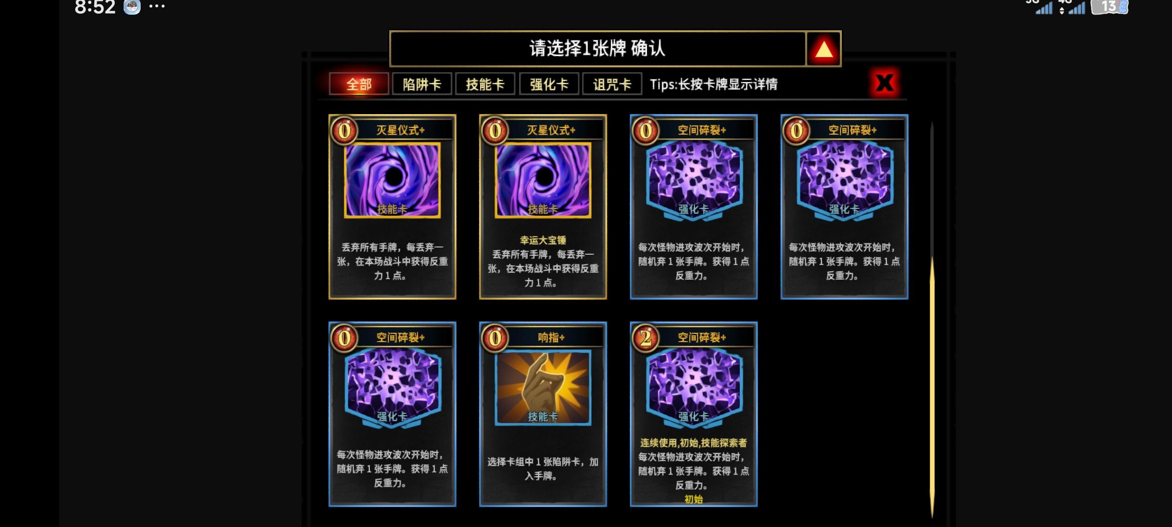 💡 必备实用技巧掌握以下几个技巧,能极大提升你的游戏体验和通关几率:· 技巧一:学会跳过卡牌 在开局“三选一”或击败敌人后选卡时,如果卡牌与你的流派不符或会污染卡组,可以果断点击“跳过”按钮不拿。保持卡组精简、高效是关键。· 技巧二:善用暂停与移动 战斗中可以随时暂停。暂停时,你可以仔细规划、无压力地移动已经布置好的陷阱(每个陷阱移动后有10秒冷却),这在战况紧急或需要调整布局时非常有用