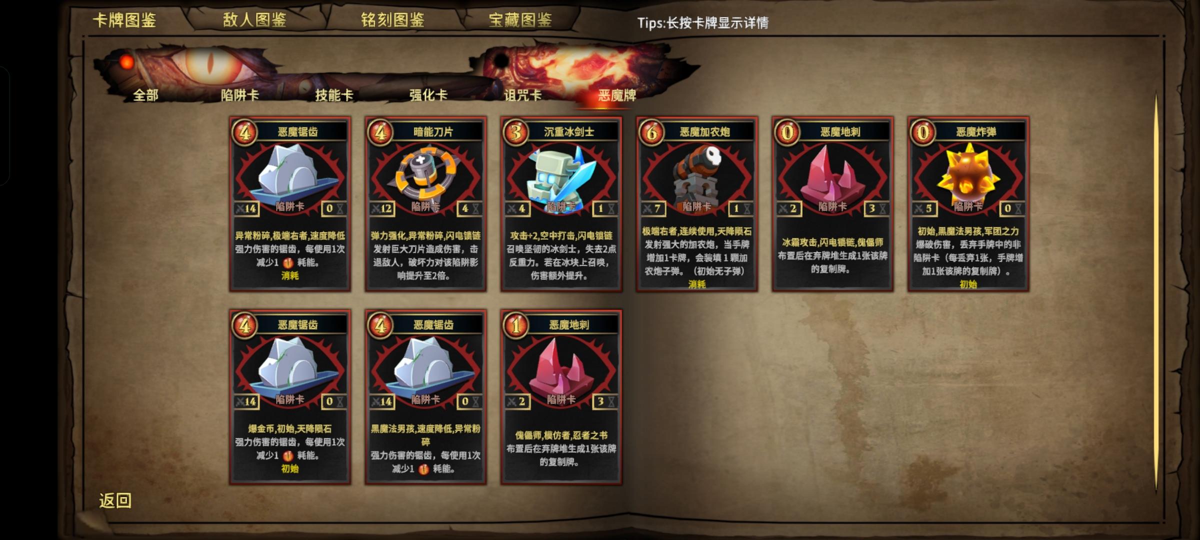 我爬到第九关的时候才攒够恶魔眼球,还得算上签到给的几百个 1.每通关一次可以选择一张恶魔卡2.前几关用的最多的就是反弹机关,因为可以秒杀,只要有水就很好用3.前期恶魔锯齿也很好用,伤害高,还挺长,每用一次,下次减少一点耗能,我用它通关3次4.爆金币词条很好用,用于刷金币很快的5.刚开始玩的时候,通关都有40几张卡,后来发现闪退很