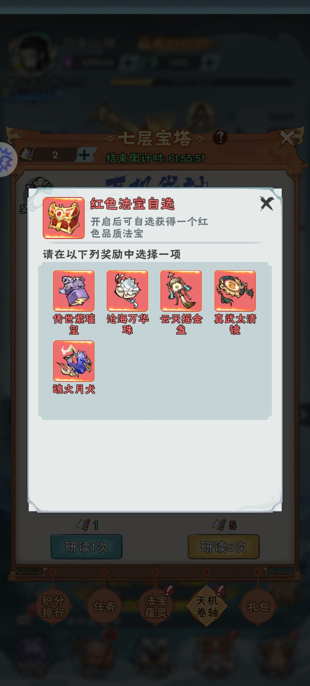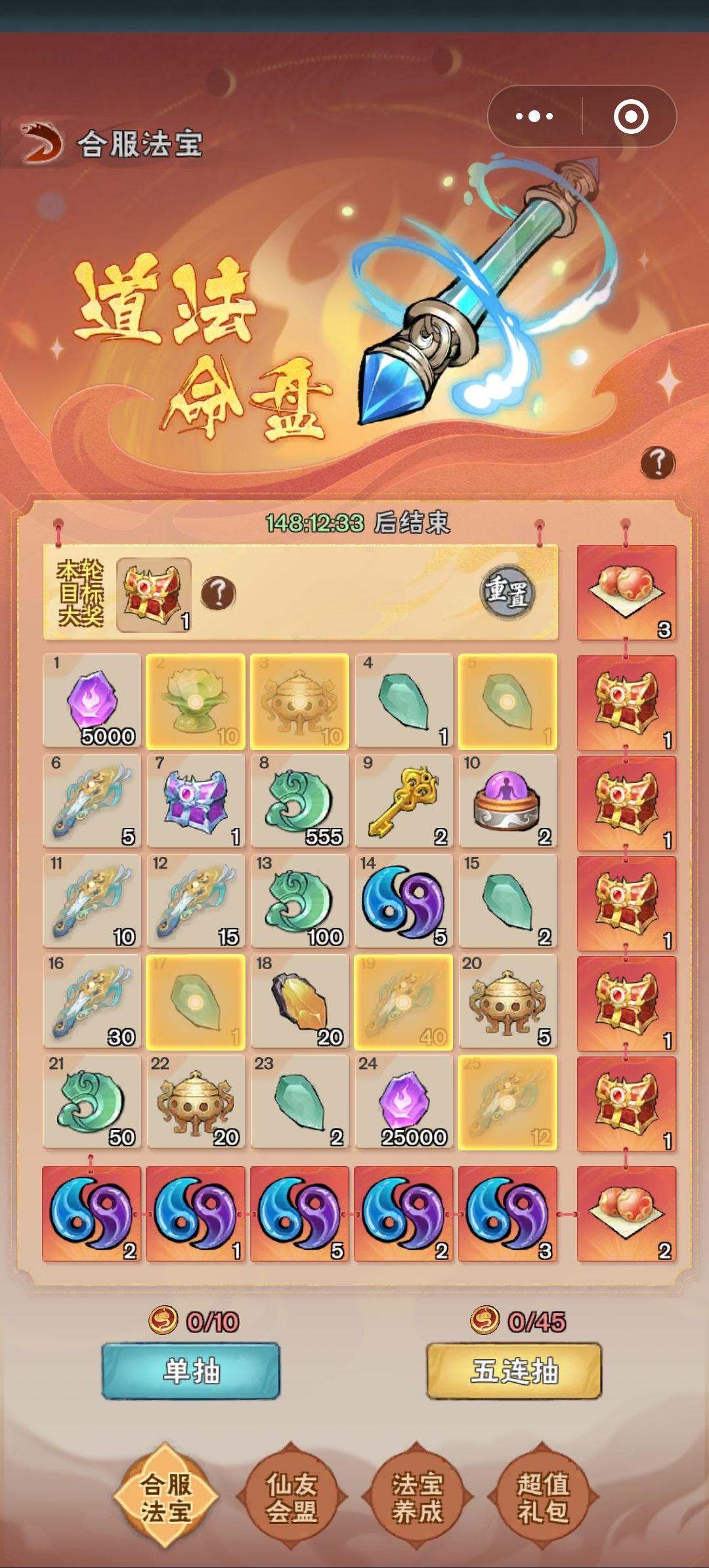 开服前面的灵珠抽奖活动消耗太大,导致灵珠钥匙攒的太少,我还没开抽,参考“伏妖达标”活动,第一轮和后几轮会有所差异,所以就不想发攻略误导大家了,这里简单以第一轮为例吧,梳理一下,给自己后续作为参考吧。 300灵珠钥匙一轮,总共五轮,由于部分珍贵的灵珠,需要飞升后才能产出,建议飞升以后再抽,活动期间无法飞升的话,还是建议本轮轮空,直接等下轮吧。 第一轮,消耗300聚灵匙,获得17聚灵匙,20紫色自选灵