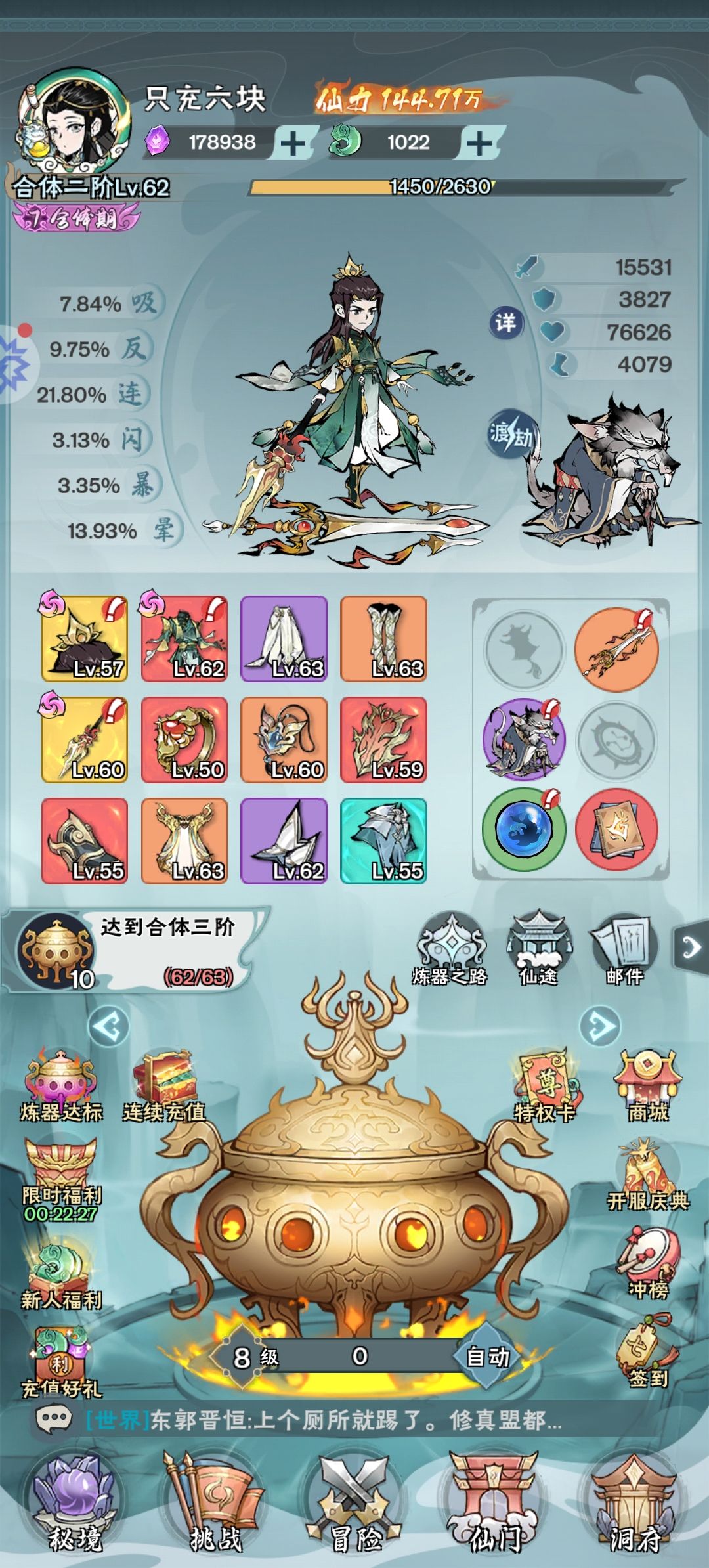 炼器鼎: 装备介绍: 角色装备一共有12中,分别为头饰、衣服、下装、鞋子、武器、戒指、吊坠、护符、肩甲、披风、护腕、腰带。 属性: 生命:基础属性,生命值为0时战斗失败。 攻击: 攻击越高战斗中造成伤害越高。 防御: 减少战斗中受到的伤害。 速度: 速度高的一方在战斗中率先出手 吸血: 战斗中根据造成伤害按吸血百分比恢复生命值。 闪避: 有概率躲避一次敌方攻击伤害。 暴击: 攻击时