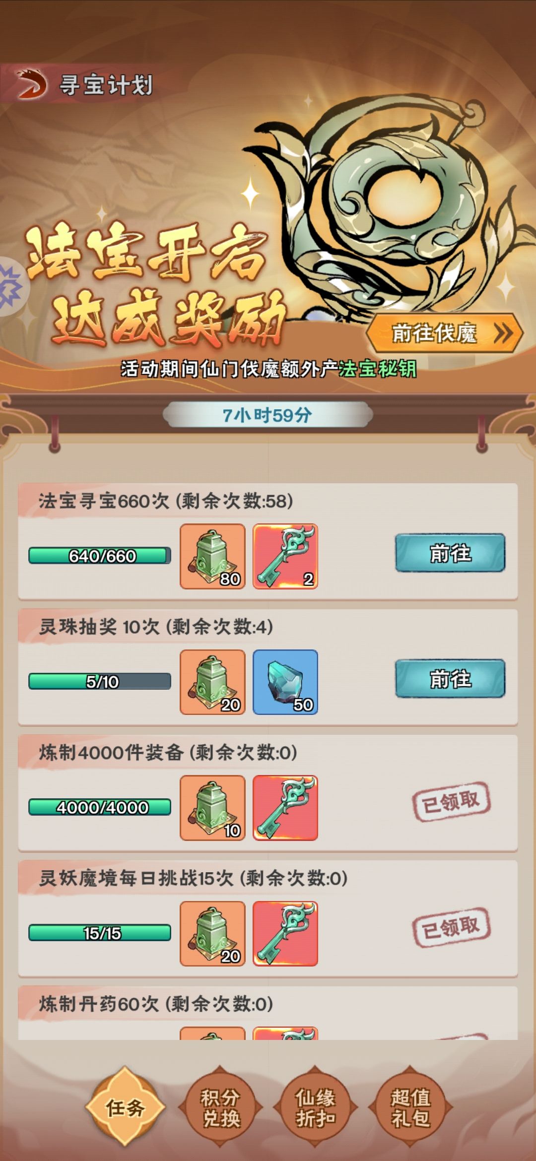 最后一个循环活动了,这个活动也不需要多少轮,就是兑换东西,整体来说没啥可说的。 活动最后,我是拿到3000代币,正好换到70神装碎片,10个法宝钥匙,10个聚灵钥匙。 每抽10个法宝钥匙,可以给40代币+1钥匙,相当于9钥匙抽10抽。 其他任务要求可以参考我的图,基本上都能全部完成。 法宝抽了640抽,灵珠抽了5抽(主要为了完成战令活动,每天一抽,干脆凑一下),开了4000个箱子,魔境挑战15次,