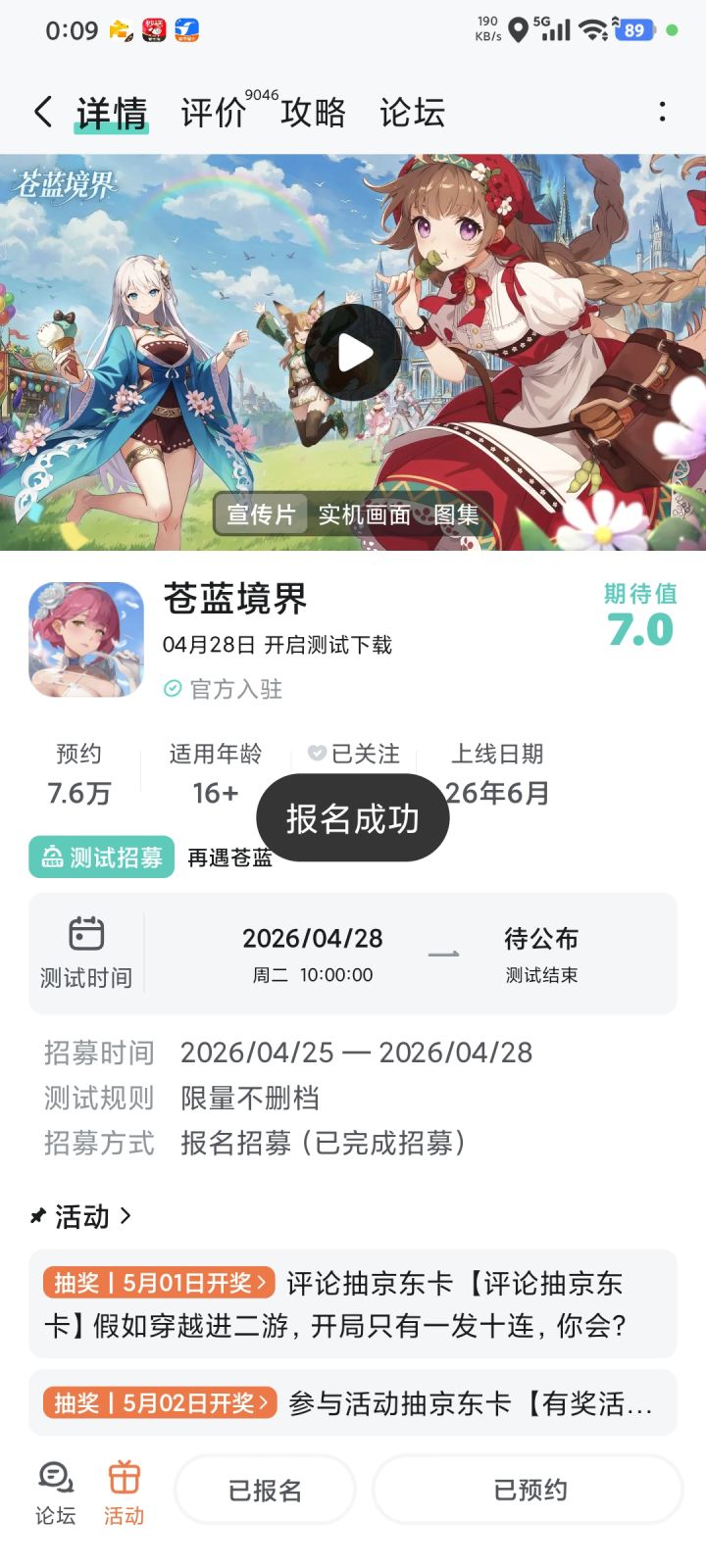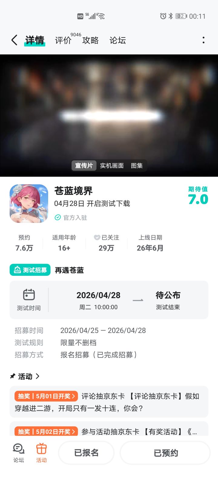 各位玩家好:《苍蓝境界》「再遇苍蓝」限量测试招募开启!你的世界,从此分裂二次元动漫RPG手游《苍蓝境界》是一款综合了角色收集养成、横版即时战斗、多人合作挑战等玩法的二次元角色扮演类手游。游戏画面精美华丽,角色立绘惊艳萌动,风格媲美动漫,背景宏大设定别致,立体呈现绝美的幻想冒险之旅。>>>点击即可参与测试招募参与晒图活动即可抽取京东卡好礼!【参与方式】1.关注《苍蓝境界》且发新帖晒游