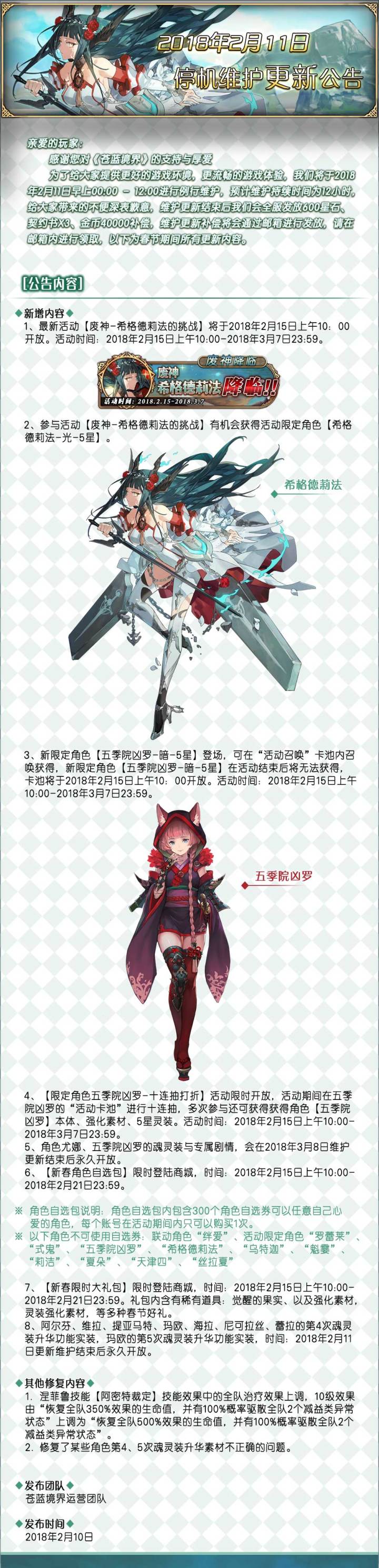 亲爱的玩家:感谢您对《苍蓝境界》的支持与厚爱为了给迎接全新版本,更好的游戏体验,我们将于2018年2月8日上午07:00- 10:00进行例行维护,预计维护持续时间为3小时,给大家带来的不便深表歉意,本次版本更新为客户端强制更新,我们将会于2月8日上午10点在官方网站和各大渠道平台上架全新版本的游戏包供玩家下载(App store和部分渠道可能会有短时间延迟)玩家下载完全新的游戏包后,我们会在
