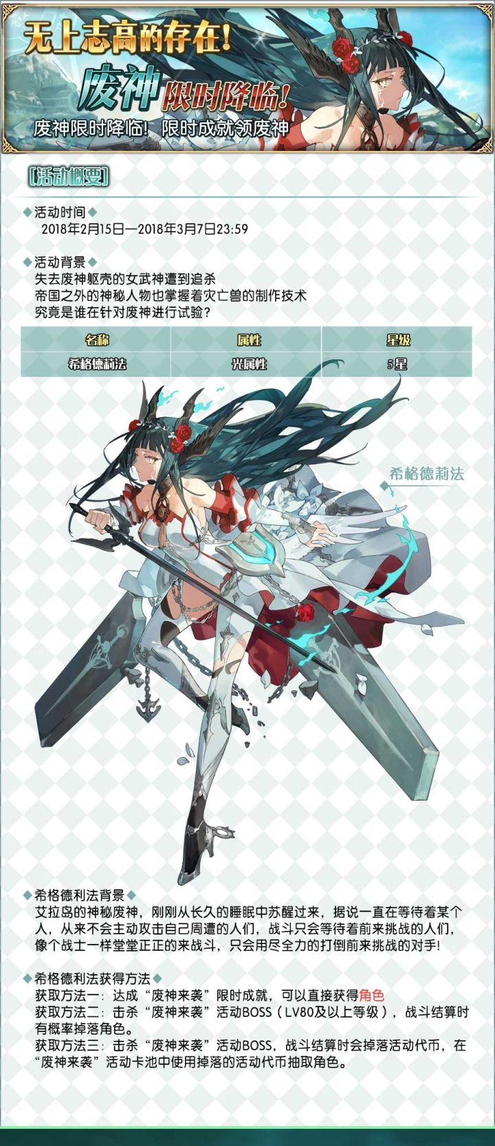 【废神来袭!希格德莉法限时领取】失去废神驱壳的女武神遭到追杀帝国之外的神秘人物也掌握着灾亡兽的制作技术究竟是谁在针对废神进行试验?2月15日,全新光属性BOSS将迎接所有人的挑战!获得【希格德莉法】的认可,就能让她加入你的队伍!星级:5星属性:光职业:战士CV:中村千绘活动具体情报请查看下图:另外送上高清壁纸一张,喜欢的小伙伴们自取啦~