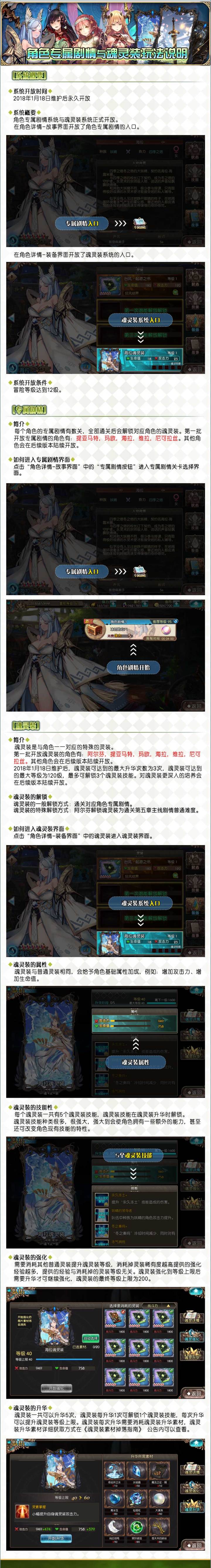 【概要】系统开放时间2018年1月18日维护后永久开放系统概要角色专属剧情系统与魂灵装系统正式开放。在角色详情-故事界面开放了角色专属剧情的入口。在角色详情-装备界面开放了魂灵装系统的入口。系统开放条件冒险等级达到12级。【专属剧情】简介每个角色的专属剧情有数关,全部通关后会解锁对应角色的魂灵装。第一批开放专属剧情的角色有:提亚马特,玛欧,海拉,维拉,尼可拉丝。(阿尔芬的专属