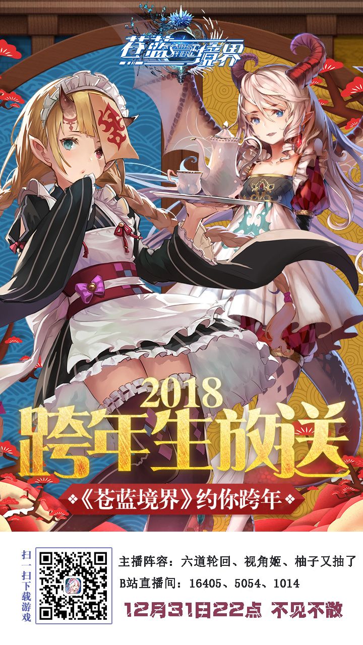 2017年,理命第一次和大家见面在2017年马上就要过去了理命还是那个可爱的理命2018年,理命会变成更加可爱的理命>▽<当然在变身之前要陪大家过新年啦~理命邀请了三位知名UP主@六道轮回【由于@Q_kun遭到流感突如其来的攻击,今天由代为直播~】@视角姬@柚子又抽了12月31日22点,在B站16405/5054/1014直播间陪大家玩苍蓝,过新年~在直播期间有各种福利掉落