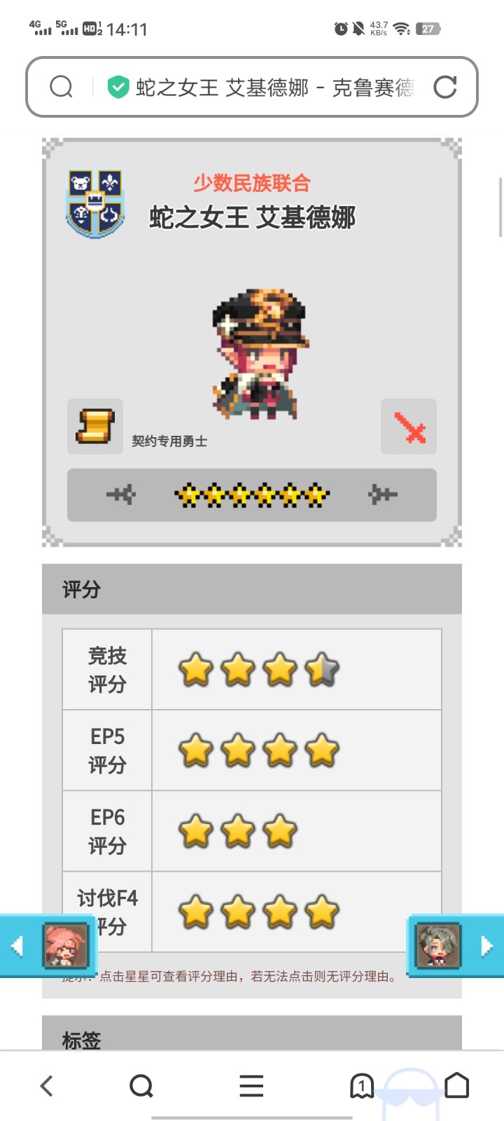 我在手游中兜兜转转,想起来玩cq国际服时,刚好迎来蛇剑大加强。直接自选蛇剑+阿狸,一路三消推到ep5,竞技场匹配到一些和我一样的菜鸟也有一战之力。