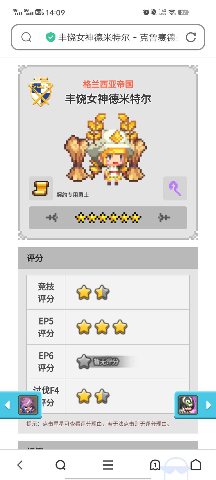 首先我抽到的第一个金票丰饶女神德米特尔,即使是这样的评分,照样单核带着我打通了主线,高阶挑战打不了,低阶也还是能带一带的。