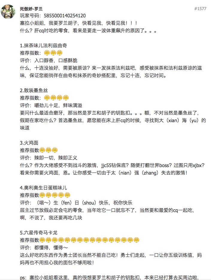 奖励已经发放完毕,请登录游戏后前往邮箱中领取~恭喜以下三位幸运玩家获得周边奖励:克鲁赛德战记立牌钥匙扣,请加入Q群,联系群主【良心的铁匠大叔】,领取你的周边奖励吧~ID:雅君艾(8826631)ID:-15℃(1366684)ID:Jie尹(4298779)看完大家的春节囤货,塞拉表示羡慕ing,你们竟然有那么多好吃的(手动@巧克莉,好好学学)你家语文老师如果知道你随便为个游戏写个80