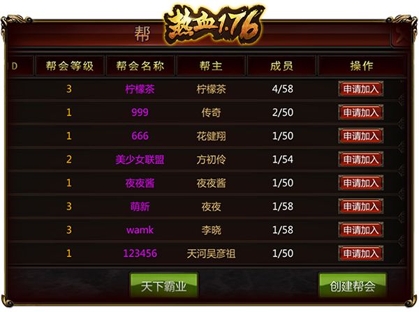 作为一款复古176的传奇手游,兄弟携手厮杀战场这种最最重要的东西肯定是不可或缺的!那么在我们《热血1.76》中,行会帮派玩法是一个非常重要的组成内容,也是与朋友兄弟们加深感情的重要枢纽。《热血1.76》中帮派系统非常完善,有很丰富的内容和玩法在等待着大家体验,今天小编就蜻蜓点水的为大家介绍一下我们的行会帮派系统吧! 当玩家进入《热血1.76》并到达30级之后,会提示你加入帮会。玩家可以在帮会列表中