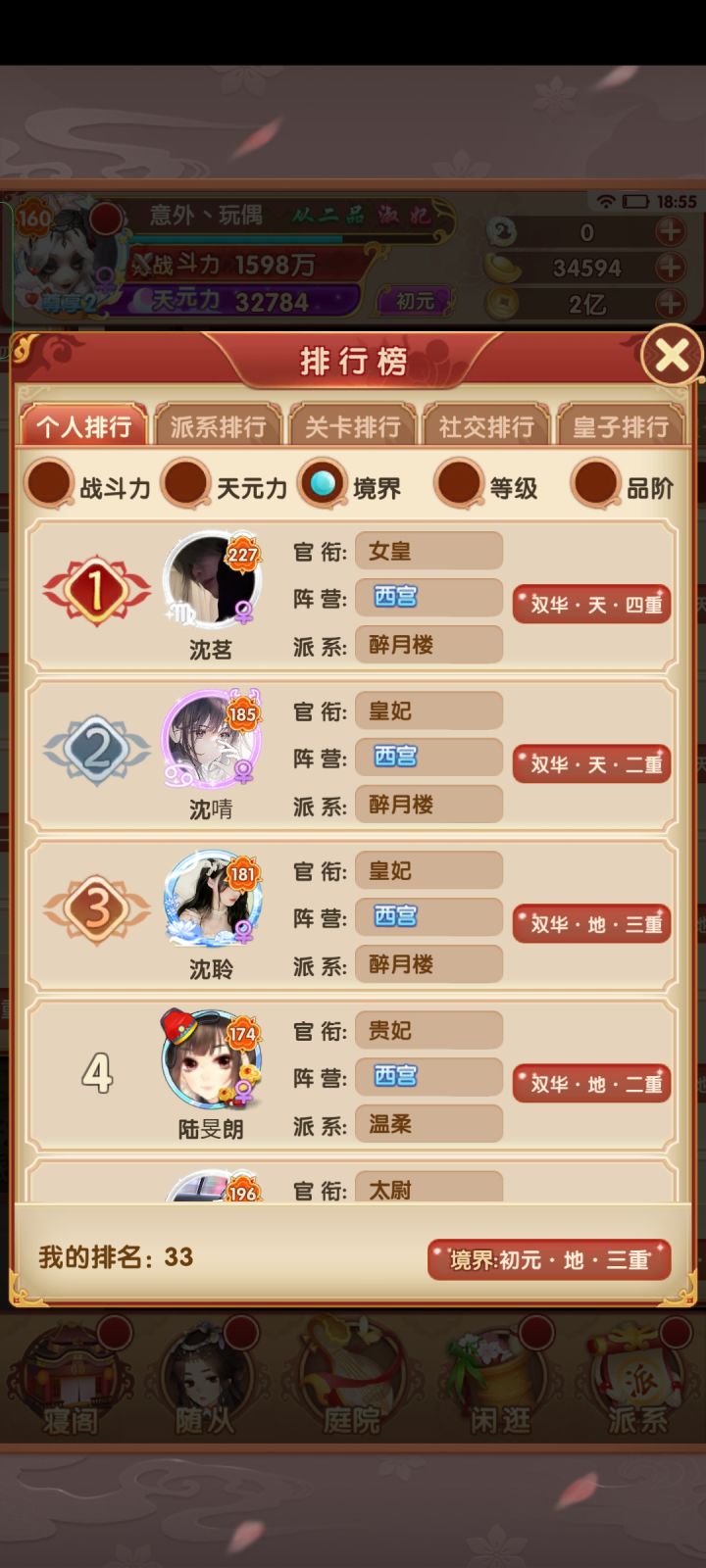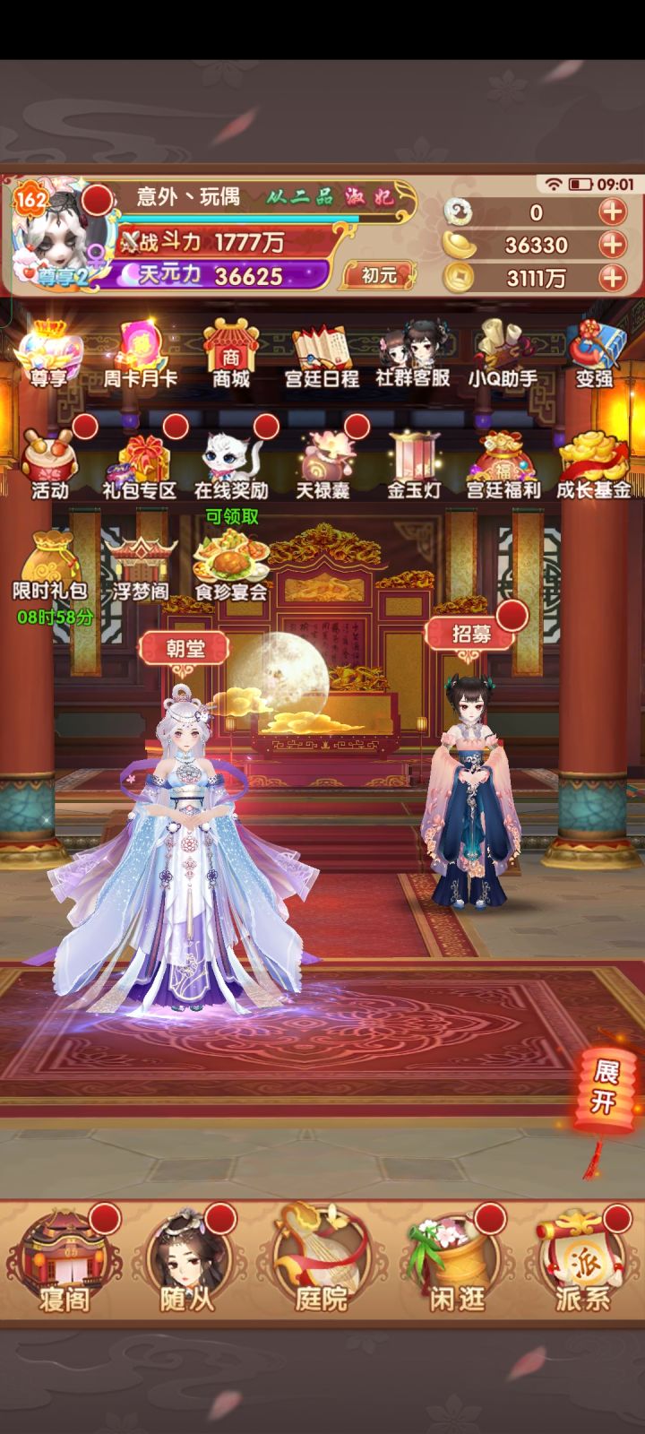 一、新手快速入门** 1. **核心玩法** - **主线推图**:解锁剧情、获取资源,提升官位(影响功能开放)。 - **角色养成**:收集随从、提升战力(资质、技能、装备、缘分)。 - **互动社交**:联姻、派系争斗、跨服战等。 2. **开局必做** - **首充推荐**:首充通常送高资质随从(如SSR级“李白”或“武则天”),性价比极高。 - **七日目标**:优先完成,奖励包含稀有随从