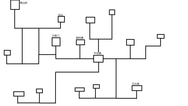 地图标志:方框:建筑(未标明名称的是地图上有但进不去的)圆:npc五角星:地图装备箭头:地图转换点虚线:地图分割大地图:平安镇:平安镇部分建筑内地图(有地图装备的):黑风寨:太极门:雪山派:玉女阁: