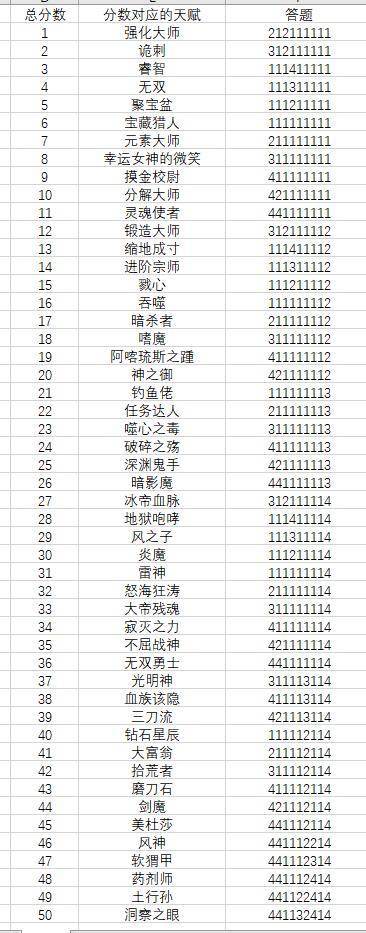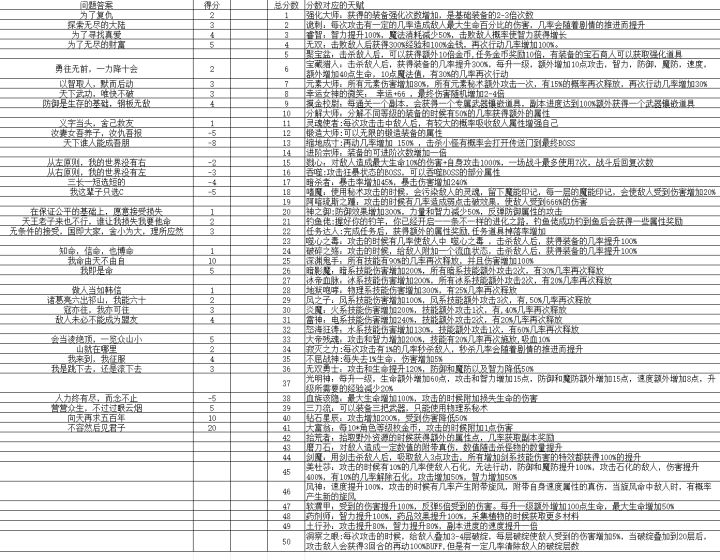 游戏开局答题和天赋对应表