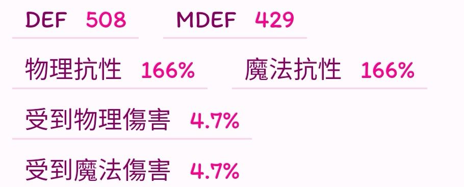 坦的双抗166%的情况下 正常防御面板以及提供的减伤: 即没有减防御的情况下,这里双抗一样,双防不一样,但是提供的物理/魔法伤害减伤数值一样 开狂战(拳双防-90%): 减伤少了0.8%/0.9%(相比于第一个),并且出现双抗一样的情况下提供的物理伤害减伤/魔法伤害减伤不一样,这里注意到def/mdef较少,且数值不一样 开步步为营+狂战(还是拳): 注意到双防已经变成负数 减伤少了2.9%/2.