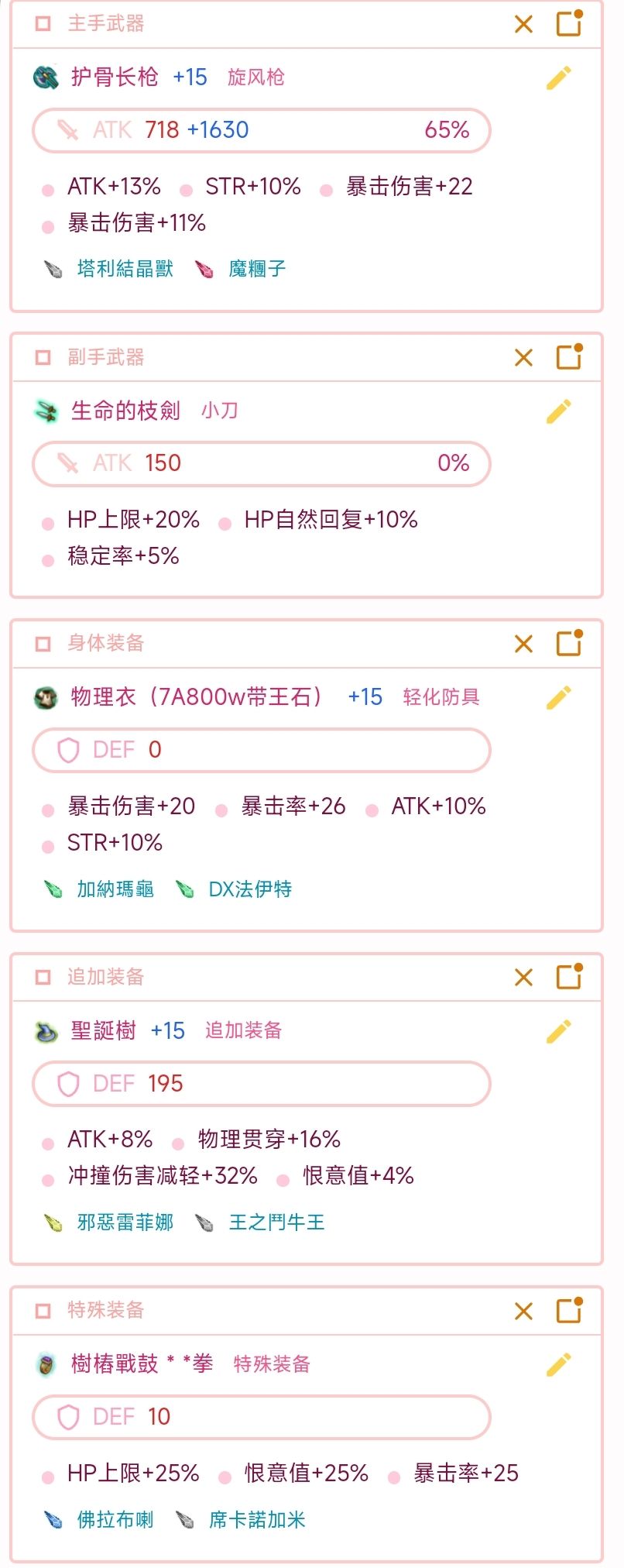 申明:介绍的配置都是不考虑使用龙牙的,龙牙真爱直接绕路() 主手:7周年宝枪 建议上对属,然后枪玩的比较多就备一把通用,单孔对属伤害比双孔通用高一大截 附魔选择: 通用附魔:(12%atk,10%str,2%暴伤,21暴伤,25暴击率)有条件%暴伤可以拉高同时也会降低成功率,自行取舍 对属附魔:众说纷纭,放几种可行的 (原属,21对属,5%atk,21暴伤,25暴击) (原属,21对属,5%atk