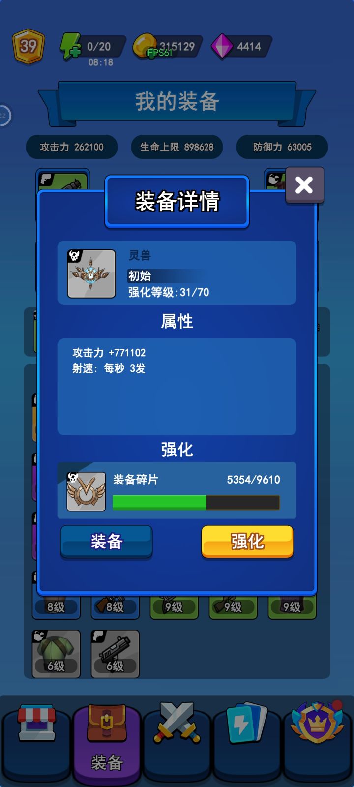 用金币抽奖 升级准备 到8-9关就可以升级宠物 攻击超高后面就靠它过关 主要还是金币抽 然后挂机金币双倍 和宠物碎片双倍 豆子 也是双倍