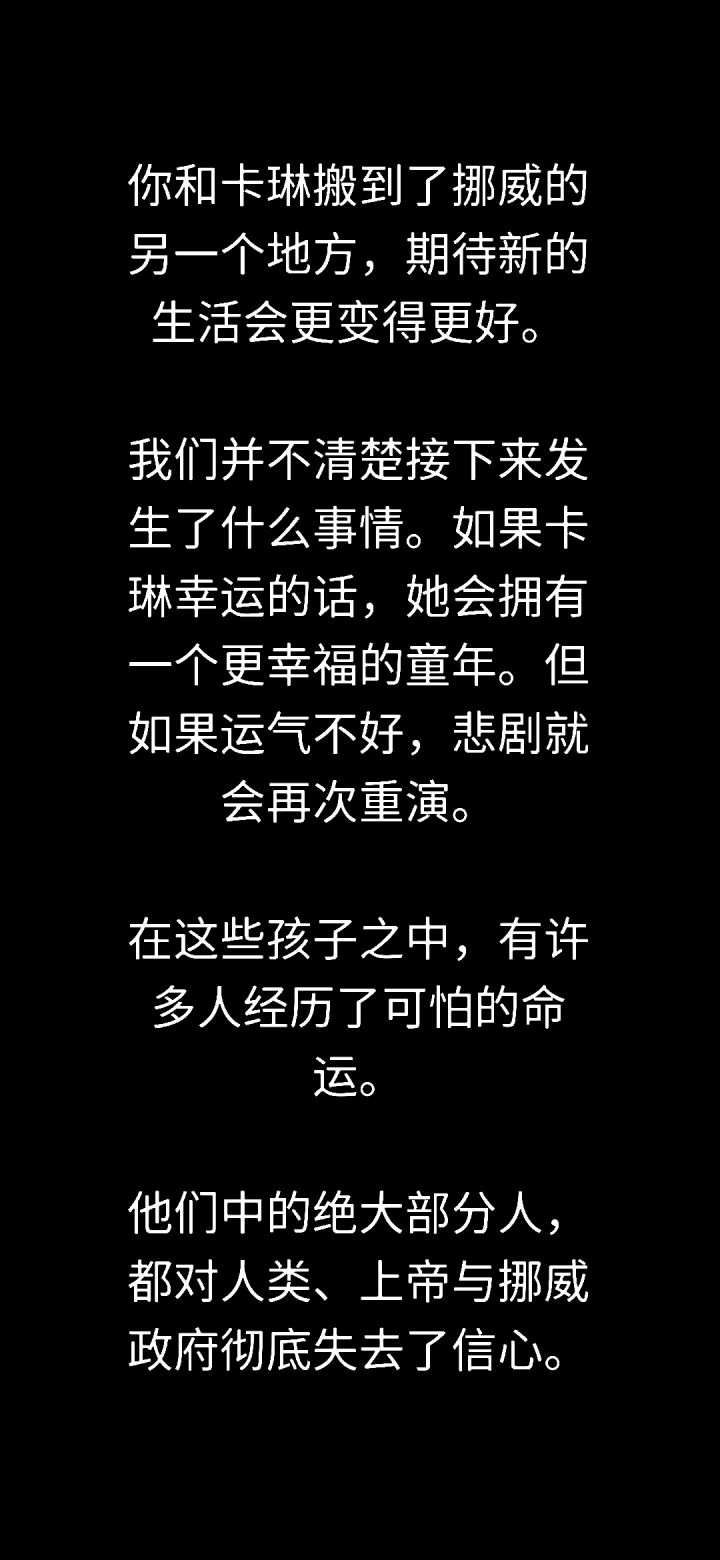 这是一个养成类游戏,游戏剧情比较吸引人。游戏根据真实历史改编,故事发生在第二次世界大战结束后的第三年——1948年,玩家“我”作为一名母亲,领养了一个名叫克劳斯的小男孩。克劳斯的身份特殊,父亲维利·弗莱舍是战时驻扎在挪威的德国士兵,母亲西里·菲尔维克是挪威的年轻姑娘,他们交往生下了克劳斯。克劳斯的母亲生他时只有16岁,未成年、未婚,也因为当时的社会氛围,将他送到了哥特霍普孤儿院。这个孤儿院也叫“生