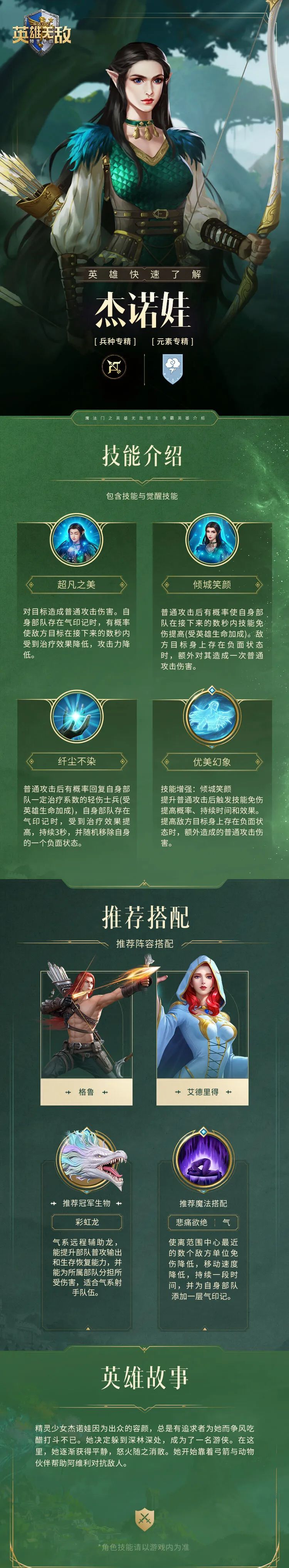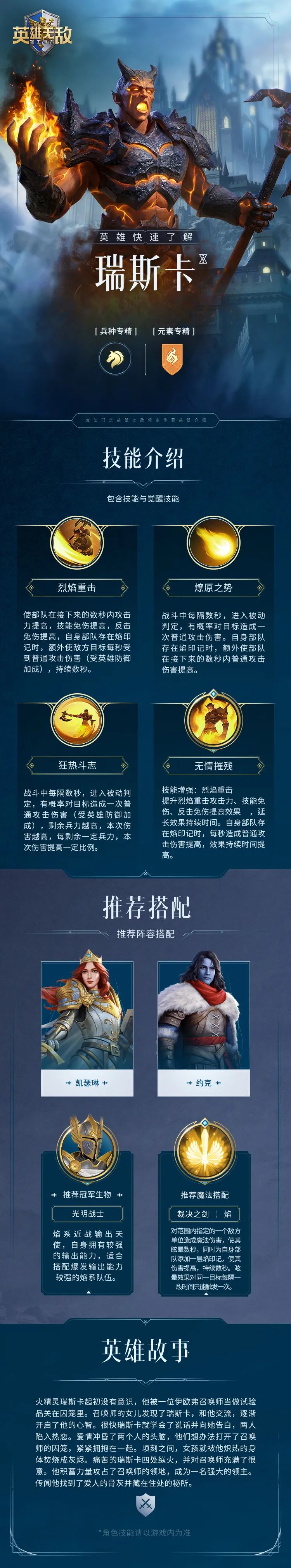 圣者斩击 对目标造成普通攻击伤害,自身兵力高于60%时,本次伤害提高。 光辉制裁 战斗中每隔3秒,进入被动判定,概率对目标造成一次普通攻击伤害,自身部队存在焰印记时,额外使其生命降低。 光明之拥 战斗中每隔6秒,进入被动判定,概率对目标造成一次普通攻击伤害,目标存在负面状态时,本次伤害提高。 圣者觉醒 技能增强:光明之拥