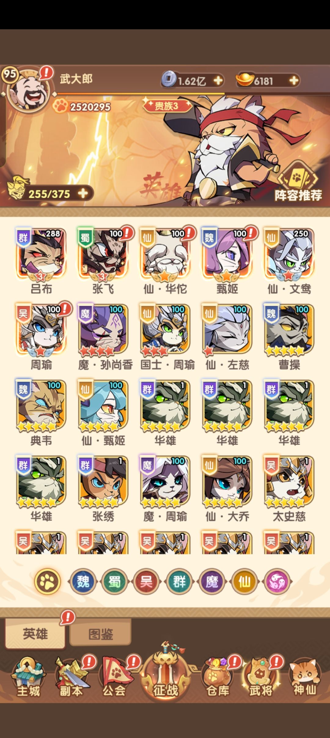 目录: 游戏基础玩法 开服七天指南 游戏活动 资源获取与兑换 阵容搭配与神将获取及培养 充值推荐 中期合区指南 前言:本人是tap服玩家,266服区,角色ID:不知道改什么。 当前版本:9.0(2025.2.13发布) 游戏礼包码(包含两个橙色兵符自选): gqkl2024 2024zqkl ltgz666 dwj666 猫三国新版本新手游戏攻略1——游戏基础玩法篇 这是一款放置类卡牌游戏,游戏的