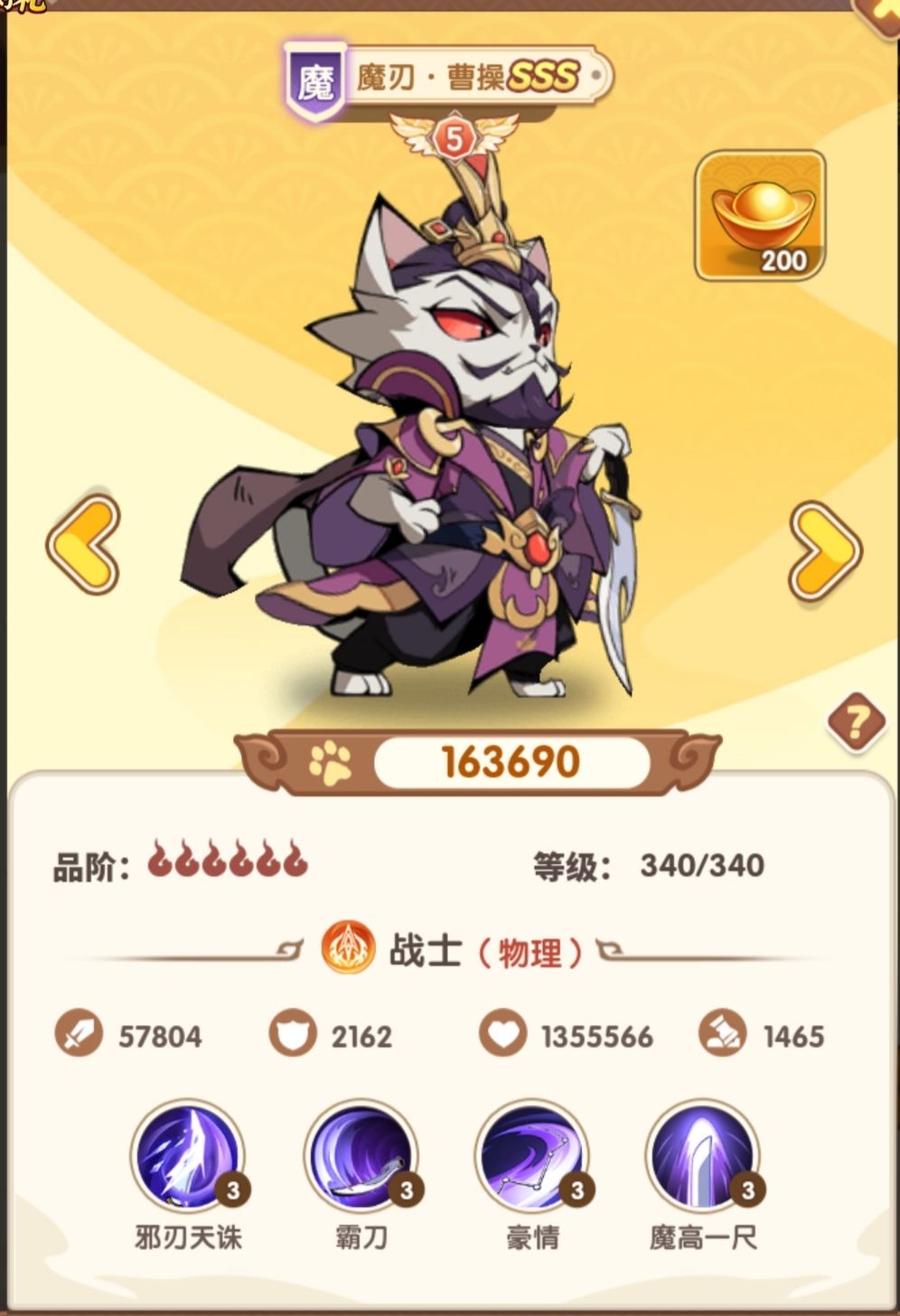 银色限时神将比较不错的打手,跟逐太史慈水平相当,但好在自身魔将阵营,在目前魔将一个能打的都没有(魔司马培养优先级不高)情况下,魔刃曹操优先培养打种族塔(虽然奖励没什么东西),缺点就是大招扣血,以及没有减伤属性。#浅评一下